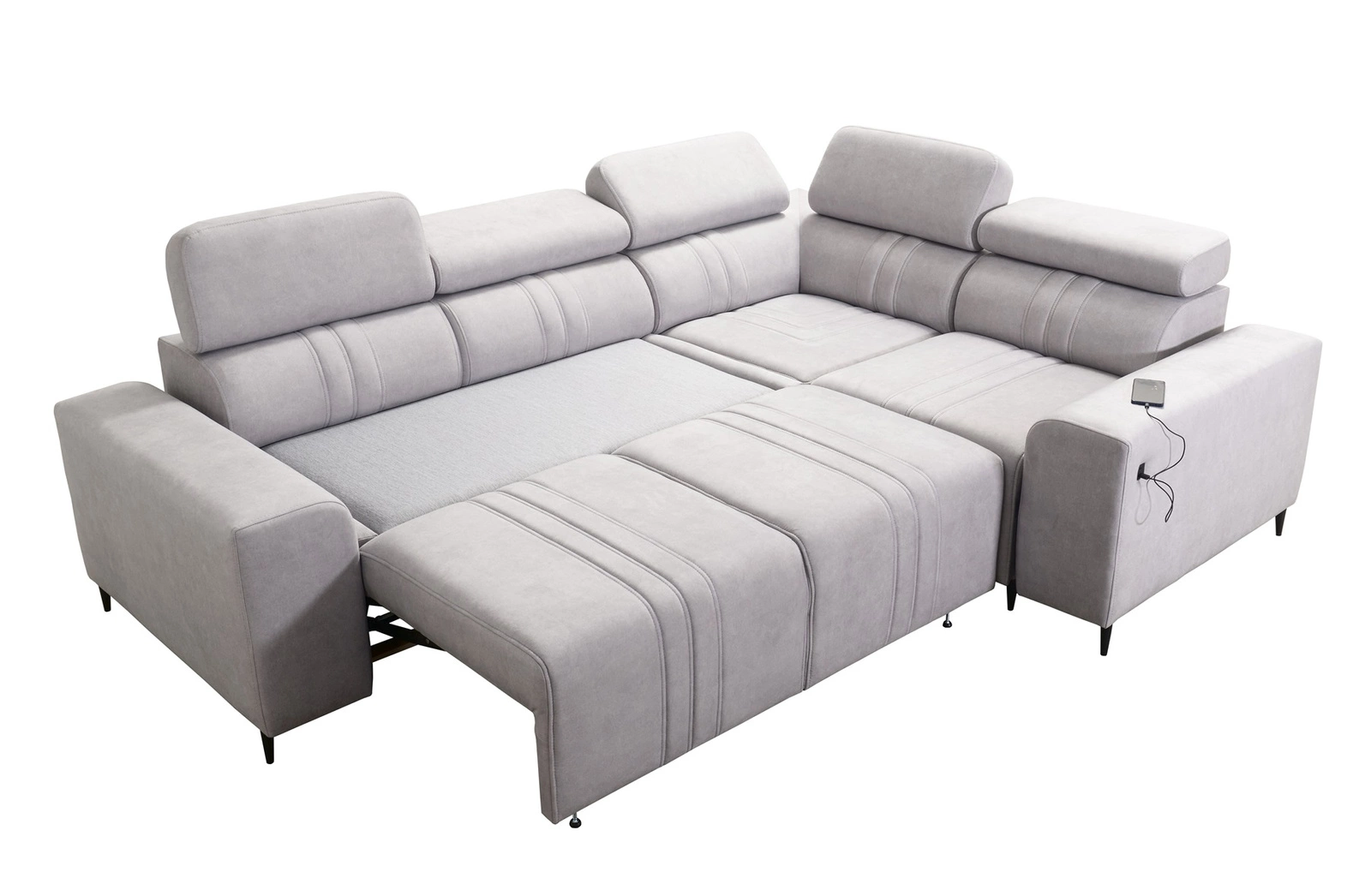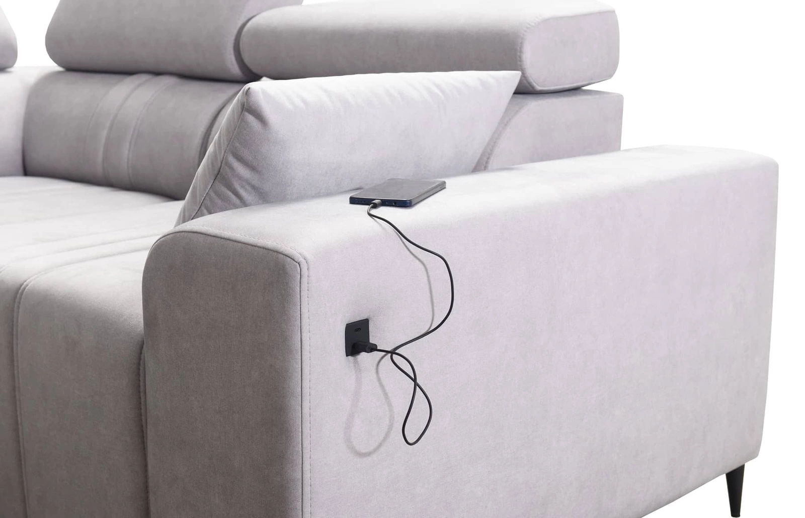 Dodatki tego mebla, które docenią wszyscy użytkownicy to pojemnik na pościel, regulowane zagłówki oraz gniazdo ładowania USB w boczku narożnika.