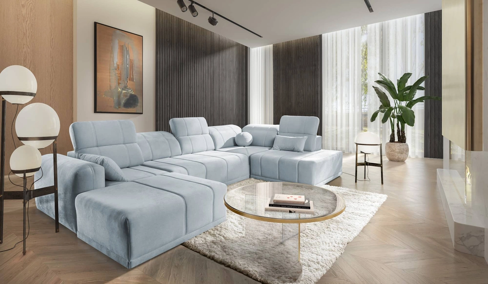 Narożnik z funkcją spania Cetara VI błękitny lewostronny komfortowy i stylowy narożnik rozkładany z przesuwanymi oparciami