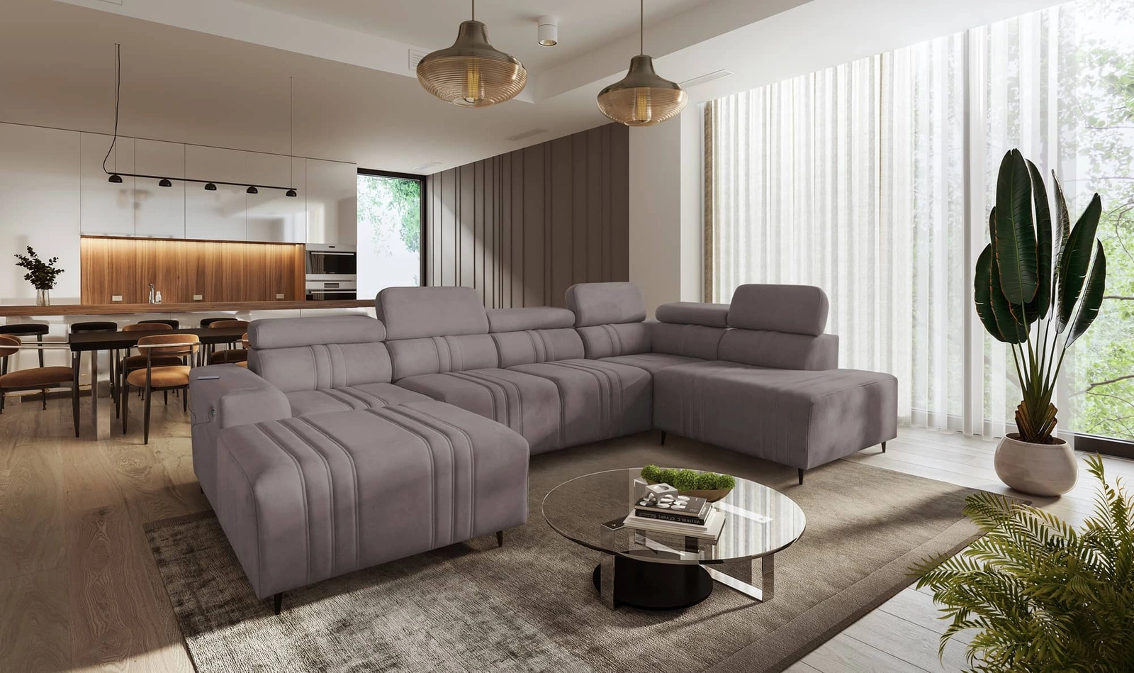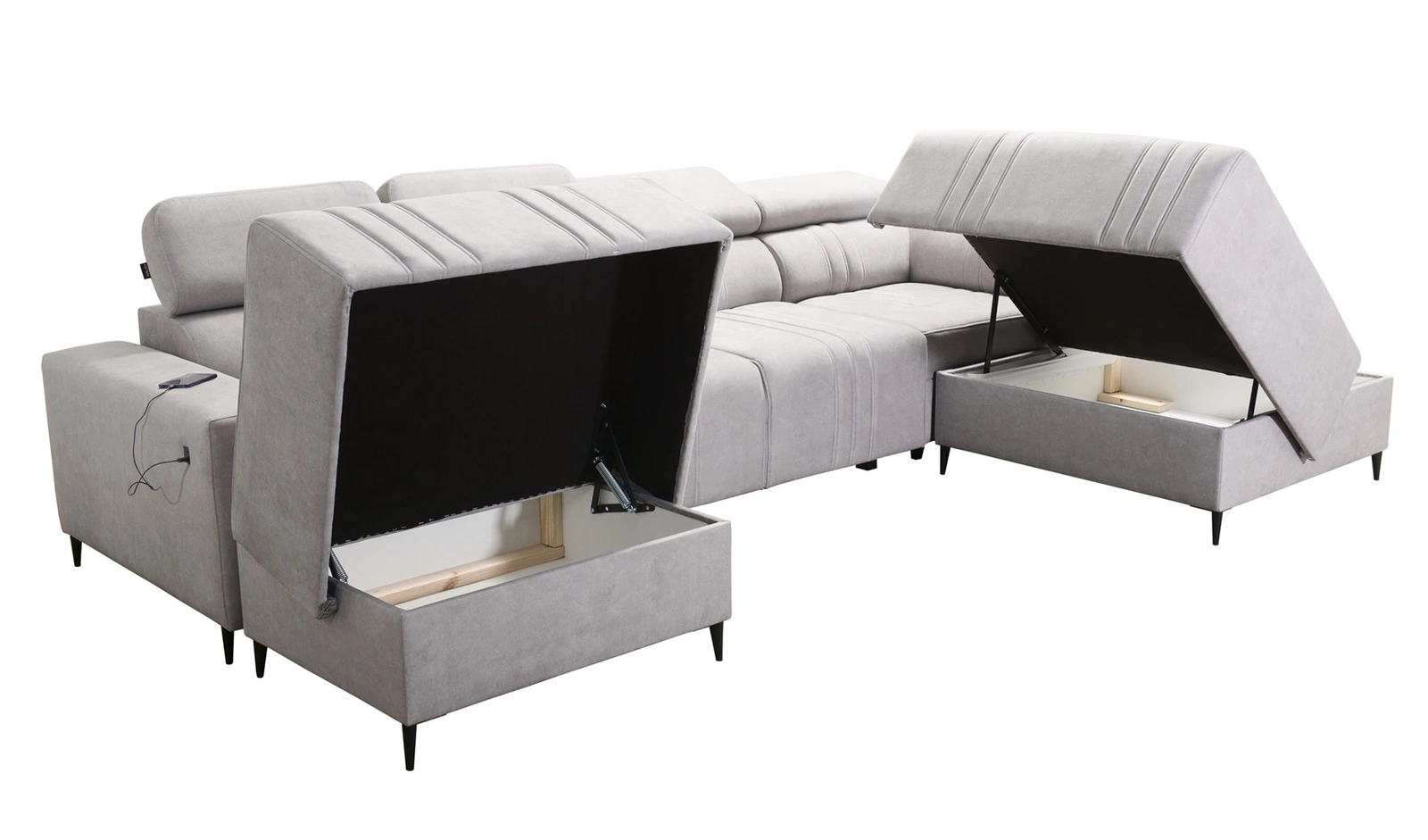Dodatki tego mebla, które docenią wszyscy użytkownicy to dwa pojemniki na pościel, regulowane zagłówki oraz gniazdo ładowania USB w boczku narożnika.