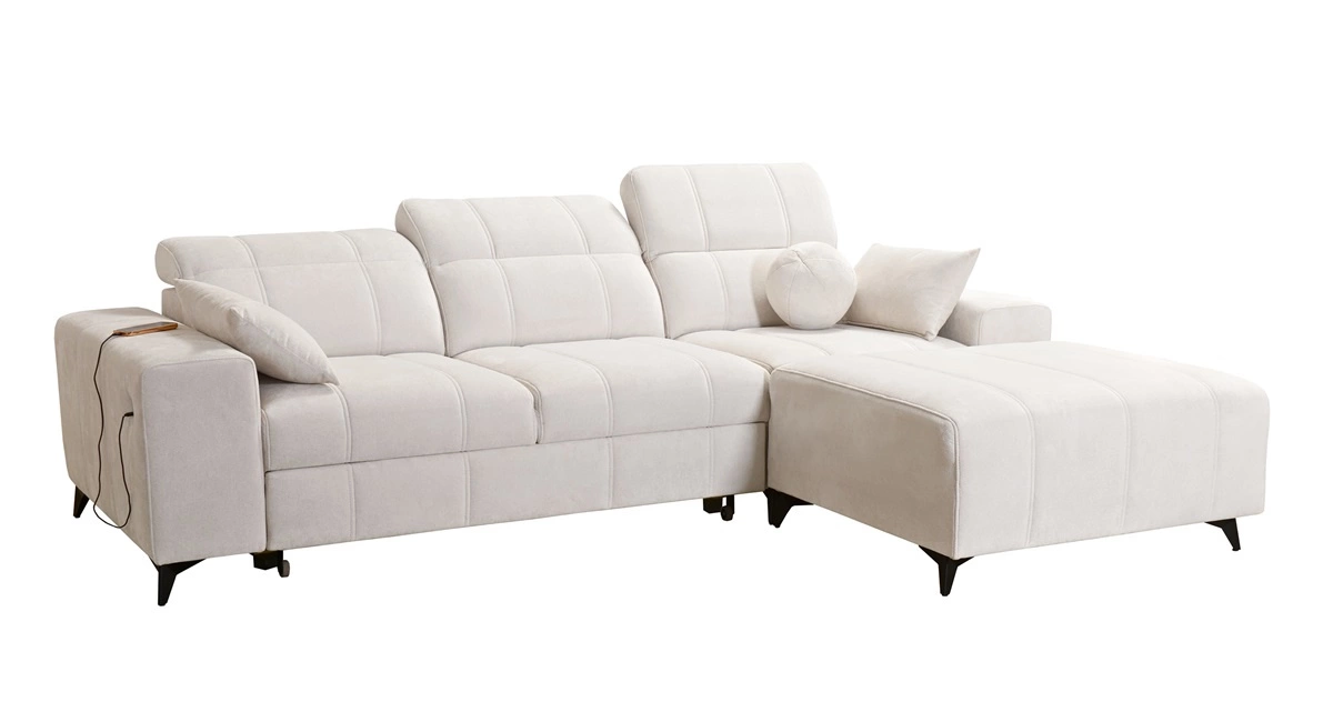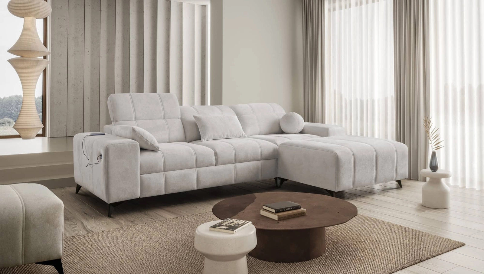 Dodatki tego mebla, które docenią wszyscy użytkownicy to pojemnik na pościel, funkcja spania oraz gniazdo ładowania USB w boczku narożnika.