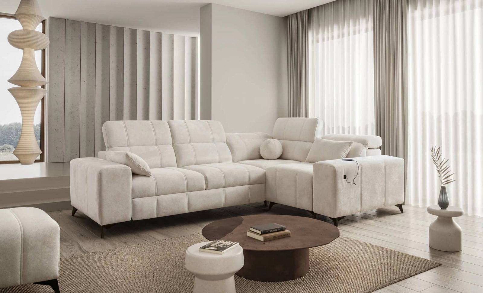 Narożnik Penejos II w kolorze kremowym z regulowanymi zagłówkami to zachwycający mebel z gwarancją najwyższego komfortu i funkcjonalności.