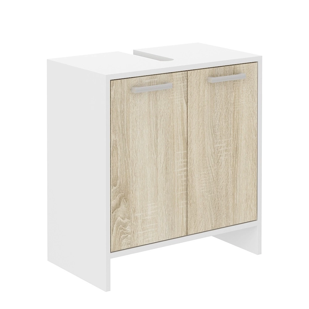 Zestaw mebli łazienkowych Mela w kolorze biały / dąb sonoma to przepis na nowoczesne oraz funkcjonalne wykończenie każdego wnętrza.
