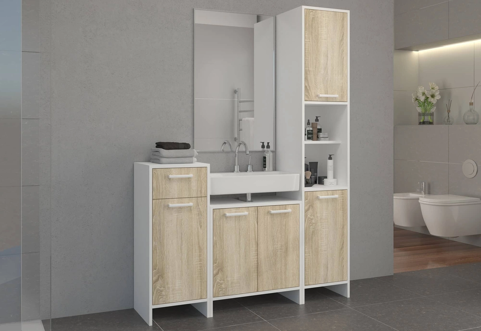 Zestaw mebli łazienkowych Mela biały / dąb sonoma meble do łazienki odporne na parę wodną wysoką temperaturę i rozlane ciecze