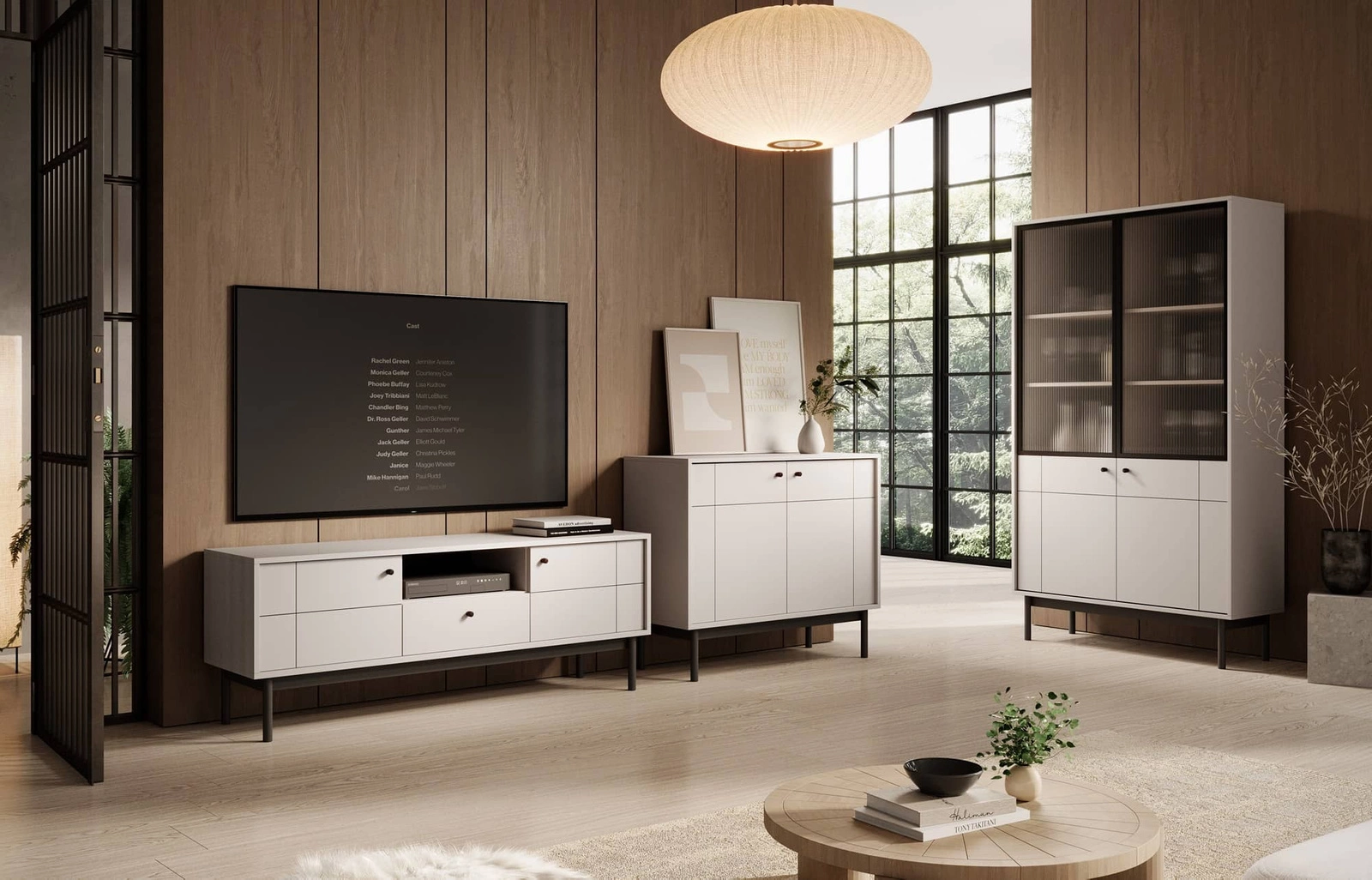 Komoda Modesta to minimalistyczna bryła łącząca w sobie elementy japońskiej estetyki z prostymi liniami skandynawskiego designu. Modny beżowy w kaszmirowym odcieniu oraz subtelnie frezowane fronty nadają elegancji dodatkowo, tworząc efektowną dekorację mebla. Stylowym wykończeniem frontów komody są niewielkie uchwyty w kolorze czarnym wykonane z metalu, które poza swoją podstawową funkcją, nadają meblom niepowtarzalnego stylu. Prosta konstrukcja, a także unikatowe wzornictwo komody z kolekcji Modesta nada pomieszczeniu lekkości i przytulnego klimatu.