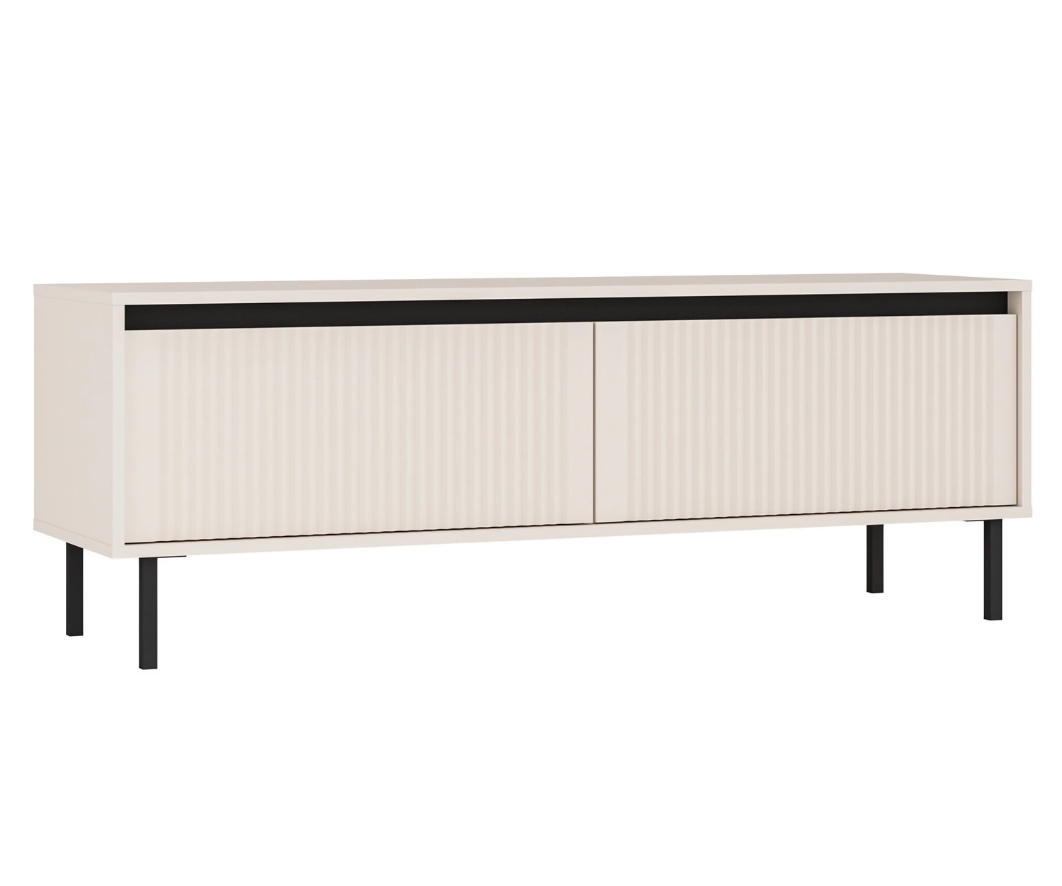 Ryflowane fronty w kolorze beżowym zostały wykonane z płyty MDF. Korpus szafki RTV wykonany został z wysokiej jakości płyty laminowanej o grubości 16mm, która charakteryzuje się odpornością na wpływ czynników zewnętrznych takich jak obicia, uderzenia i niefortunne zadrapania. Pojemne szuflady pomieszczą wszystkie rzeczy oraz niezbędne akcesoria. Metalowe nogi w kolorze czarnym nadają szczególnego charakteru przy jednoczesnym utrzymaniu funkcjonalności.