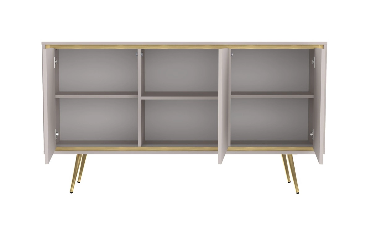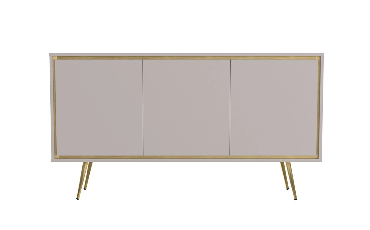 - Komoda Nevea to propozycja do wnętrz o skandynawskim i lekkim stylu. Bezuchwytowa bryła oraz beżowe tony zostały wzbogacone oryginalnym złotym obrzeżem, które przykuwa uwagę i stanowi elegancką ozdobę. Wysokie, skośne nogi nadają szczególnego charakteru.