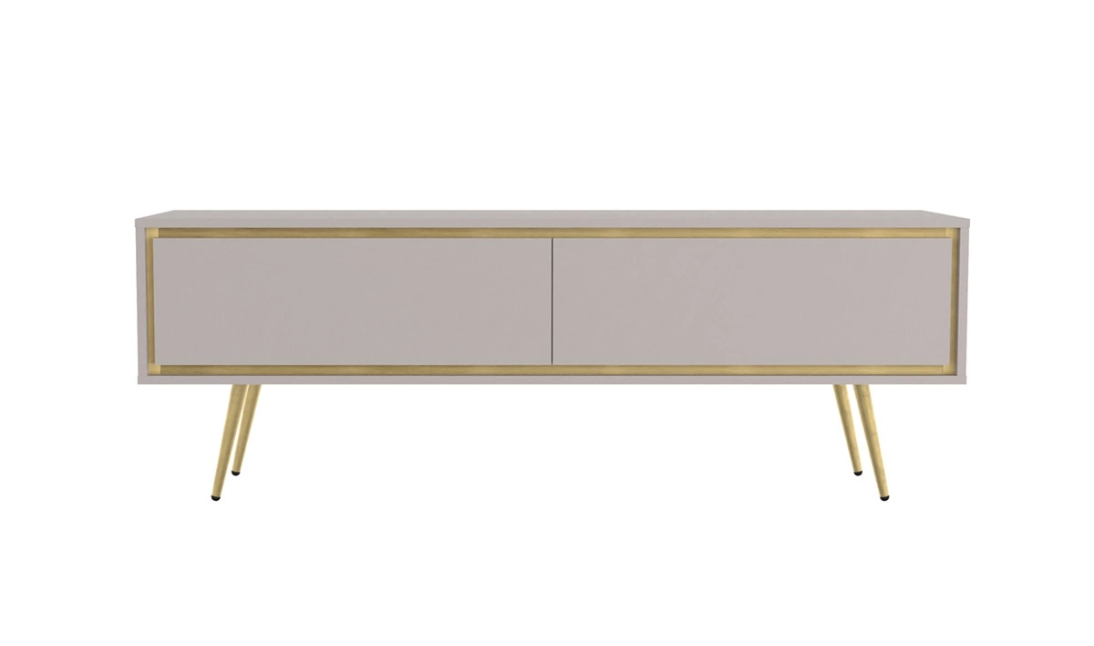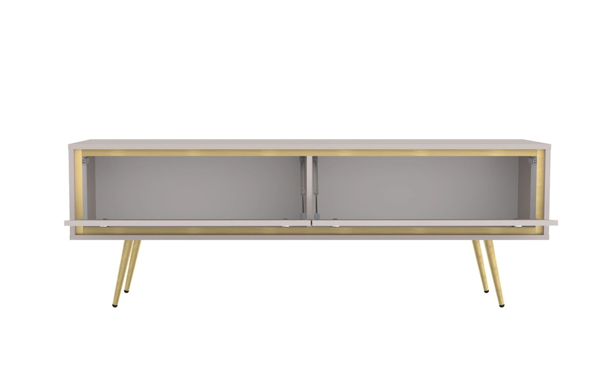 Konstrukcja mebli została wsparta na wysokich metalowych nogach w złotym kolorze, dzięki czemu bryły zyskują wizualną lekkość przy jednoczesnym utrzymaniu praktyczności. Do otwierania drzwi komody oraz szafki RTV zastosowano funkcjonalny, bezuchwytowy system push to open. Meblościanka wykonana jest z wysokiej jakości płyty laminowanej, która charakteryzuje się odpornością na wpływ czynników zewnętrznych takich jak obicia, uderzenia i niefortunne zadrapania.