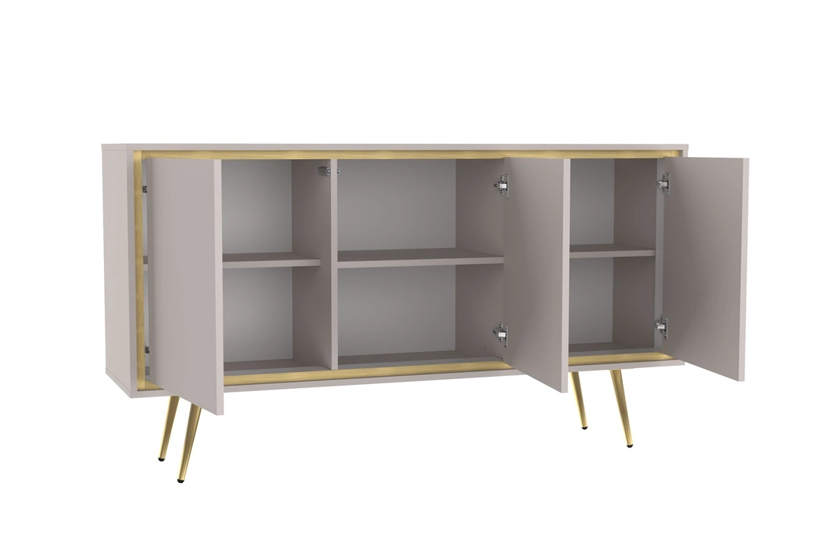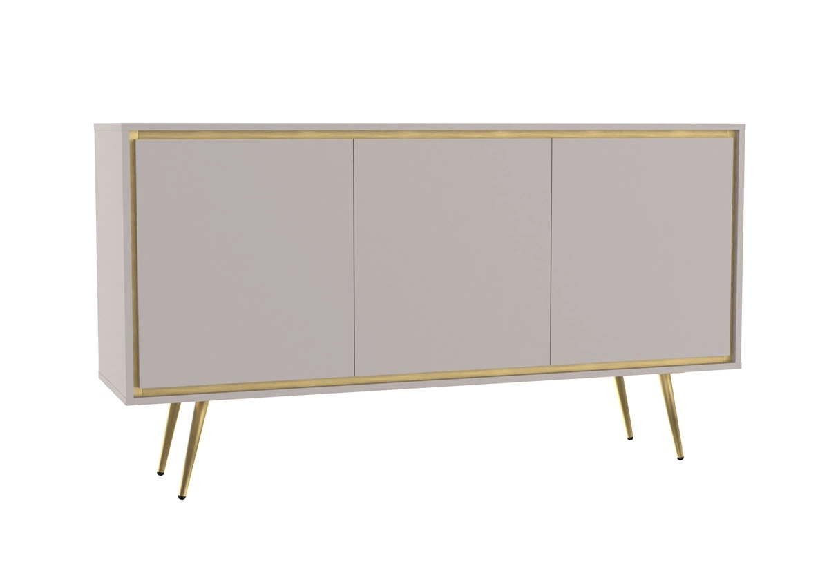 - Meblościanka Nevea to propozycja do wnętrz o skandynawskim i lekkim stylu. Bezuchwytowe bryły oraz beżowe tony zostały wzbogacone oryginalnym złotym obrzeżem, które przykuwa uwagę i stanowi elegancką ozdobę. Skośne nogi nadają szczególnego charakteru.