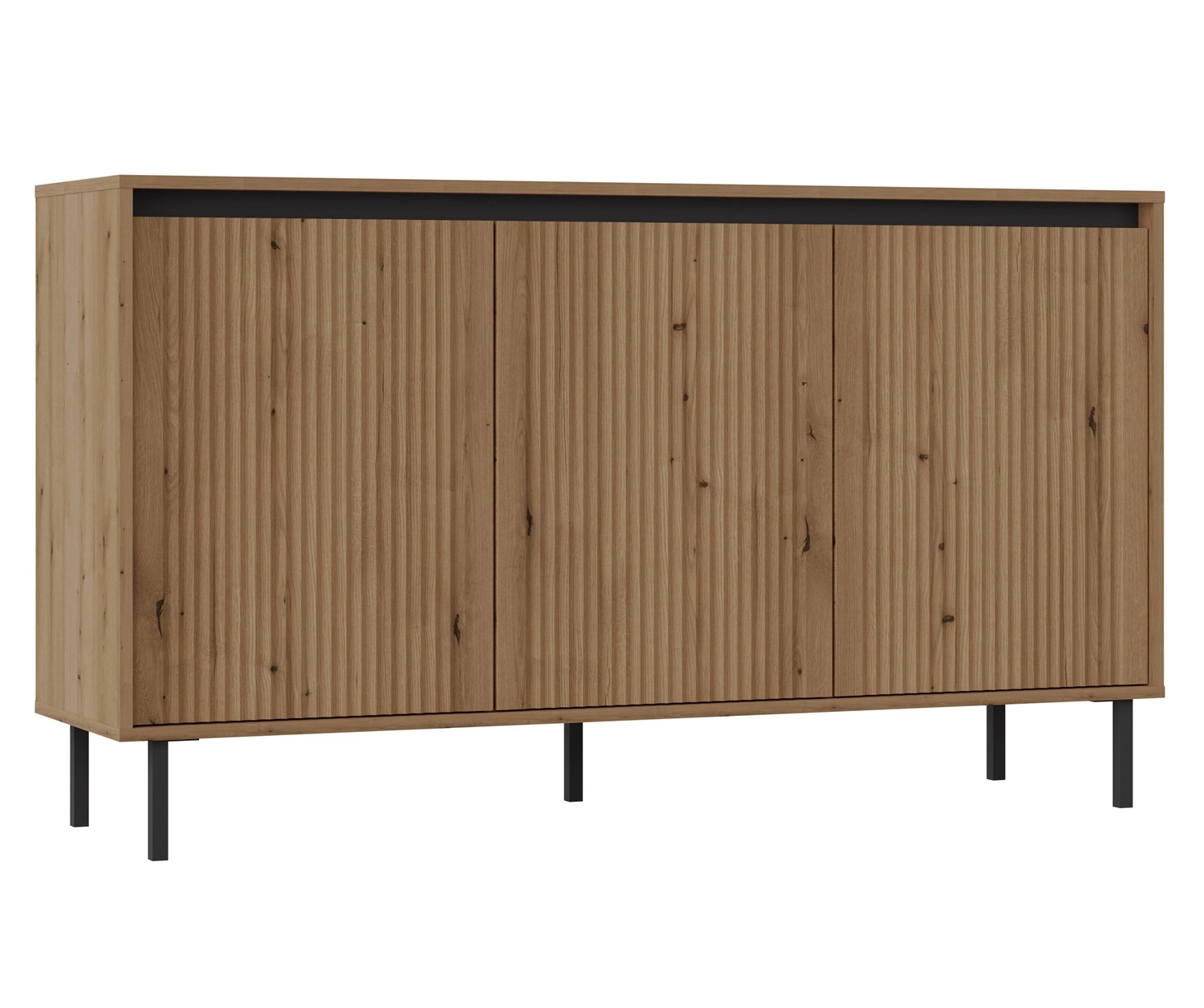 Ryflowane fronty w kolorze dębu zostały wykonane z płyty MDF. Korpus komody wykonany został z wysokiej jakości płyty laminowanej o grubości 16mm, która charakteryzuje się odpornością na wpływ czynników zewnętrznych takich jak obicia, uderzenia i niefortunne zadrapania. Metalowe nogi w kolorze czarnym nadają szczególnego charakteru przy jednoczesnym utrzymaniu funkcjonalności.