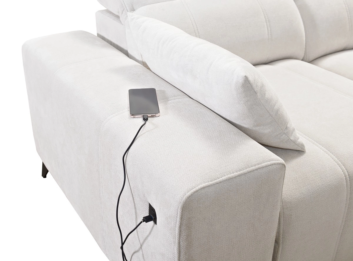 Dodatki tego mebla, które docenią wszyscy użytkownicy to dwa pojemniki na pościel, funkcja spania oraz gniazdo ładowania USB w boczku narożnika.