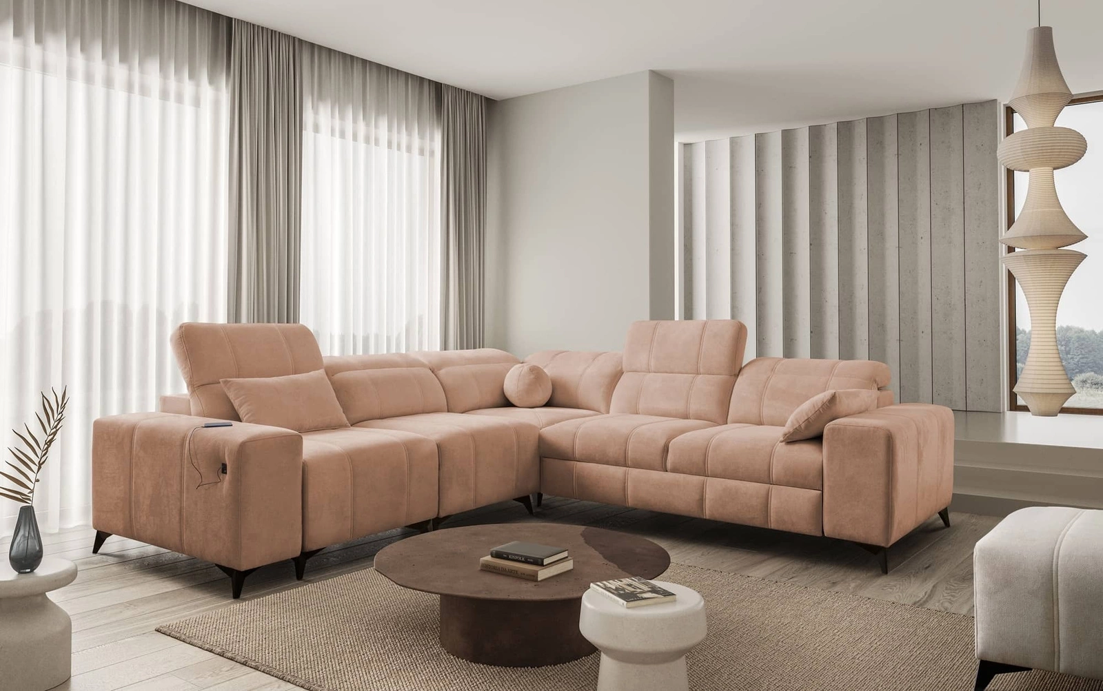 Narożnik Penejos III w kolorze łososiowym z regulowanymi zagłówkami to zachwycający mebel z gwarancją najwyższego komfortu i funkcjonalności.