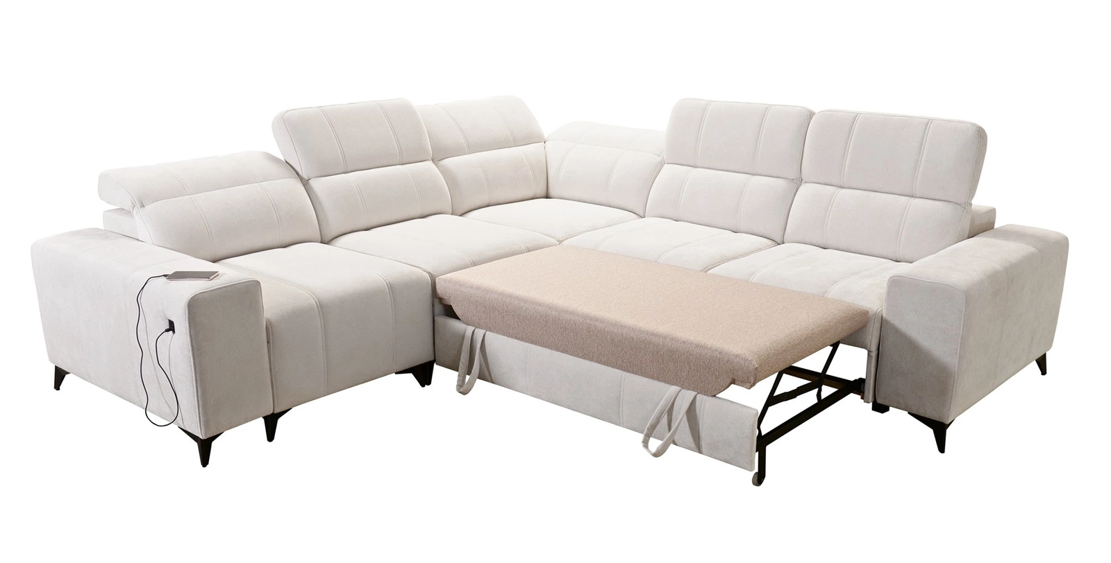 Dodatki tego mebla, które docenią wszyscy użytkownicy to dwa pojemniki na pościel, funkcja spania oraz gniazdo ładowania USB w boczku narożnika.