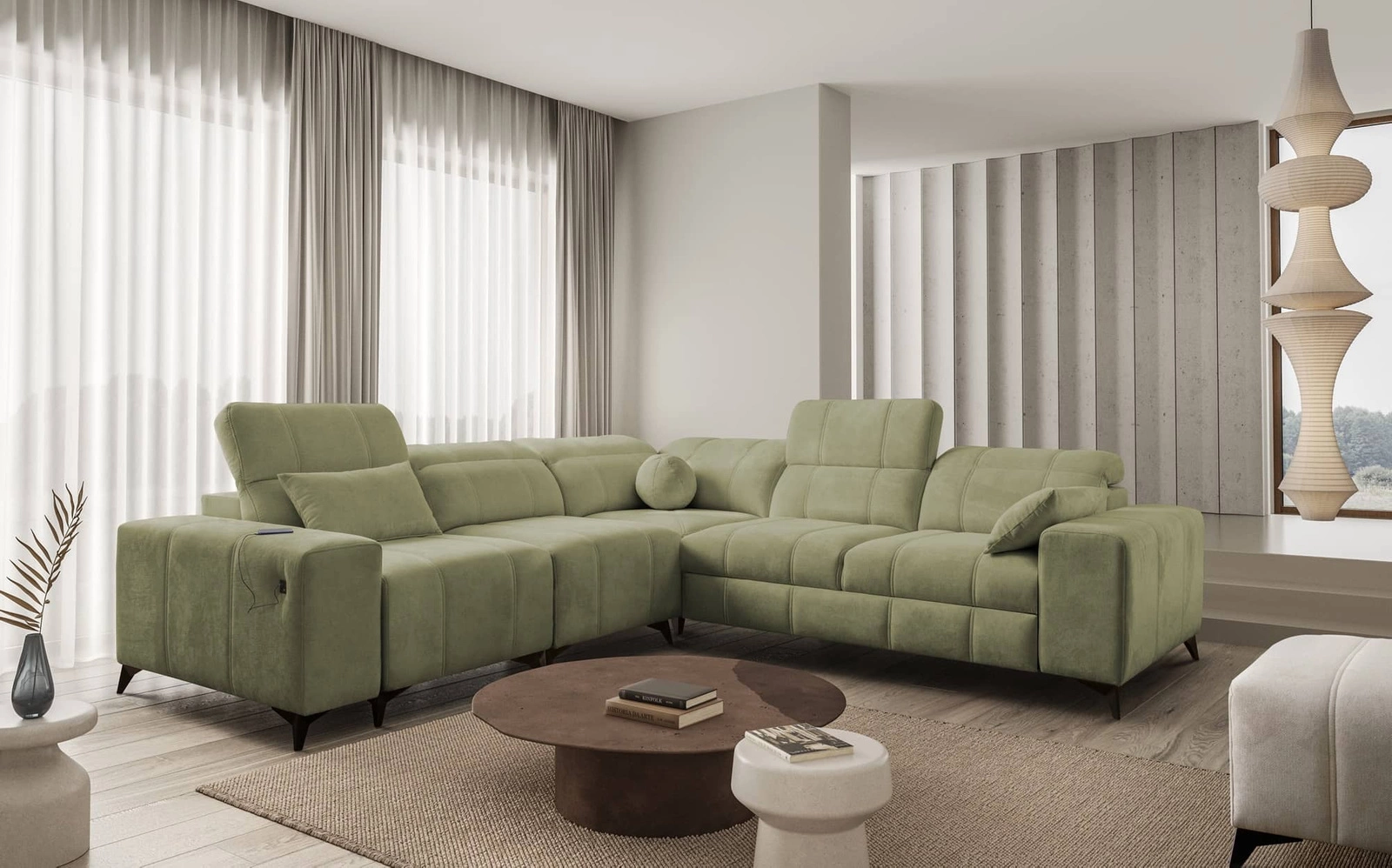 Narożnik Penejos III w kolorze oliwkowym z regulowanymi zagłówkami to zachwycający mebel z gwarancją najwyższego komfortu i funkcjonalności.