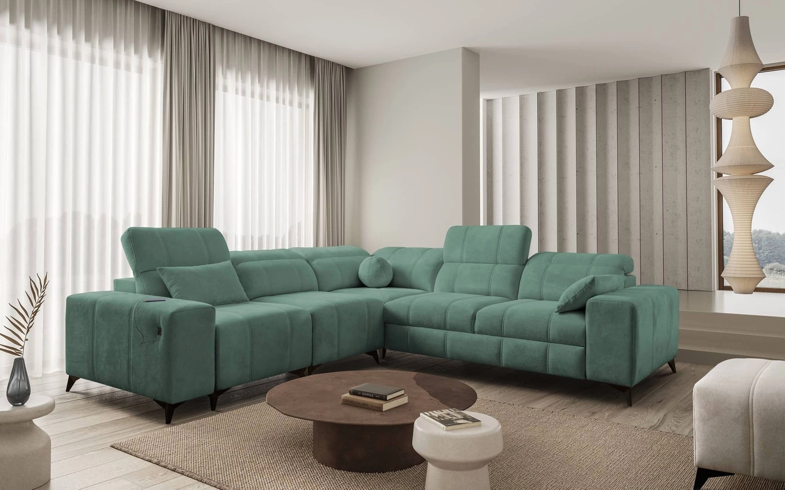 Narożnik Penejos III w kolorze zielonym z regulowanymi zagłówkami to zachwycający mebel z gwarancją najwyższego komfortu i funkcjonalności.