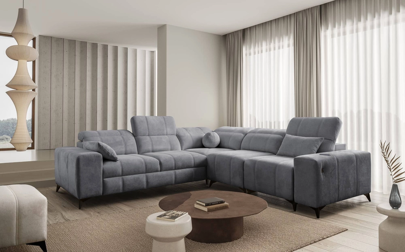 Narożnik Penejos III w kolorze szarym z regulowanymi zagłówkami to zachwycający mebel z gwarancją najwyższego komfortu i funkcjonalności.