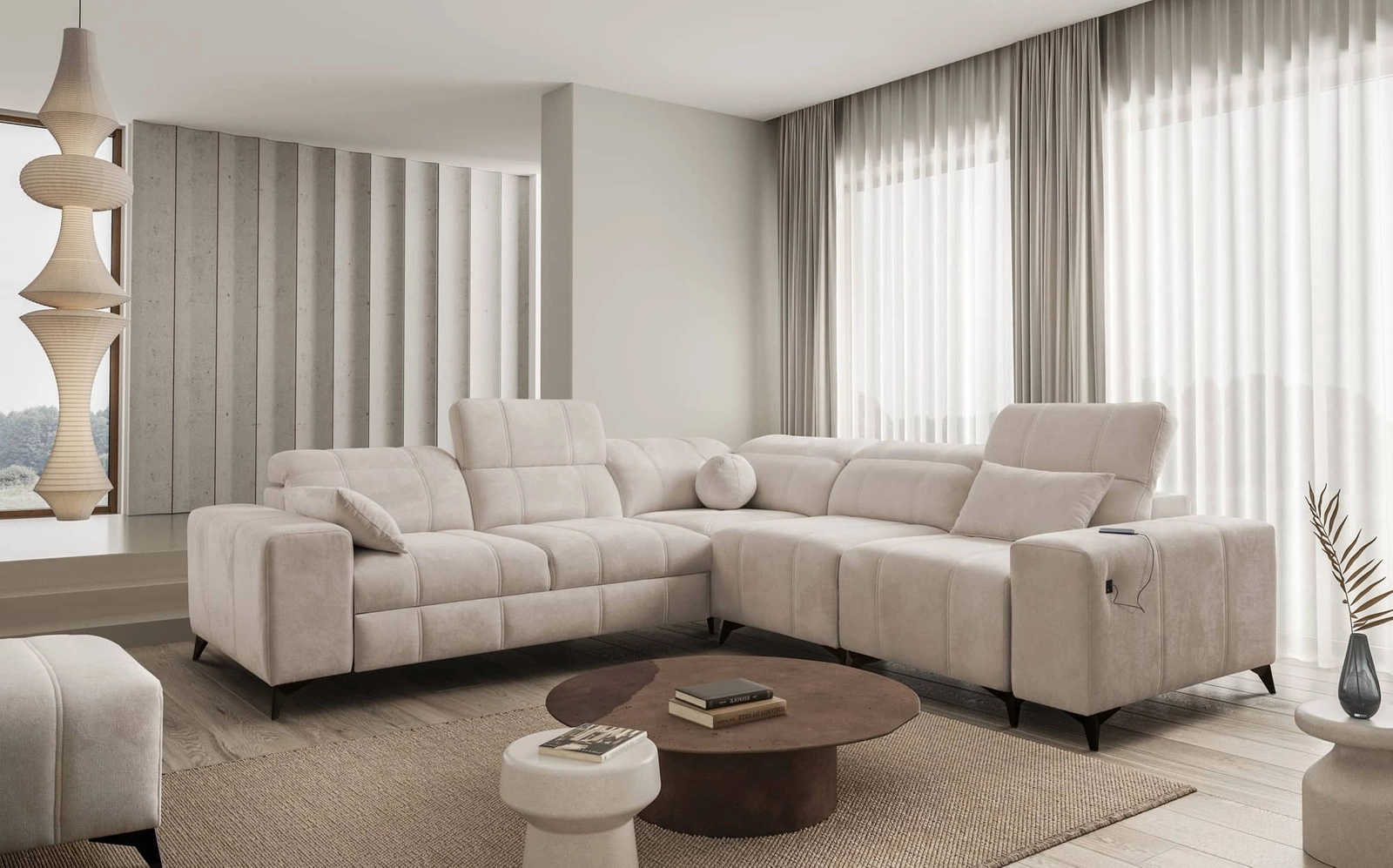 Narożnik Penejos III w kolorze beżowym z regulowanymi zagłówkami to zachwycający mebel z gwarancją najwyższego komfortu i funkcjonalności.