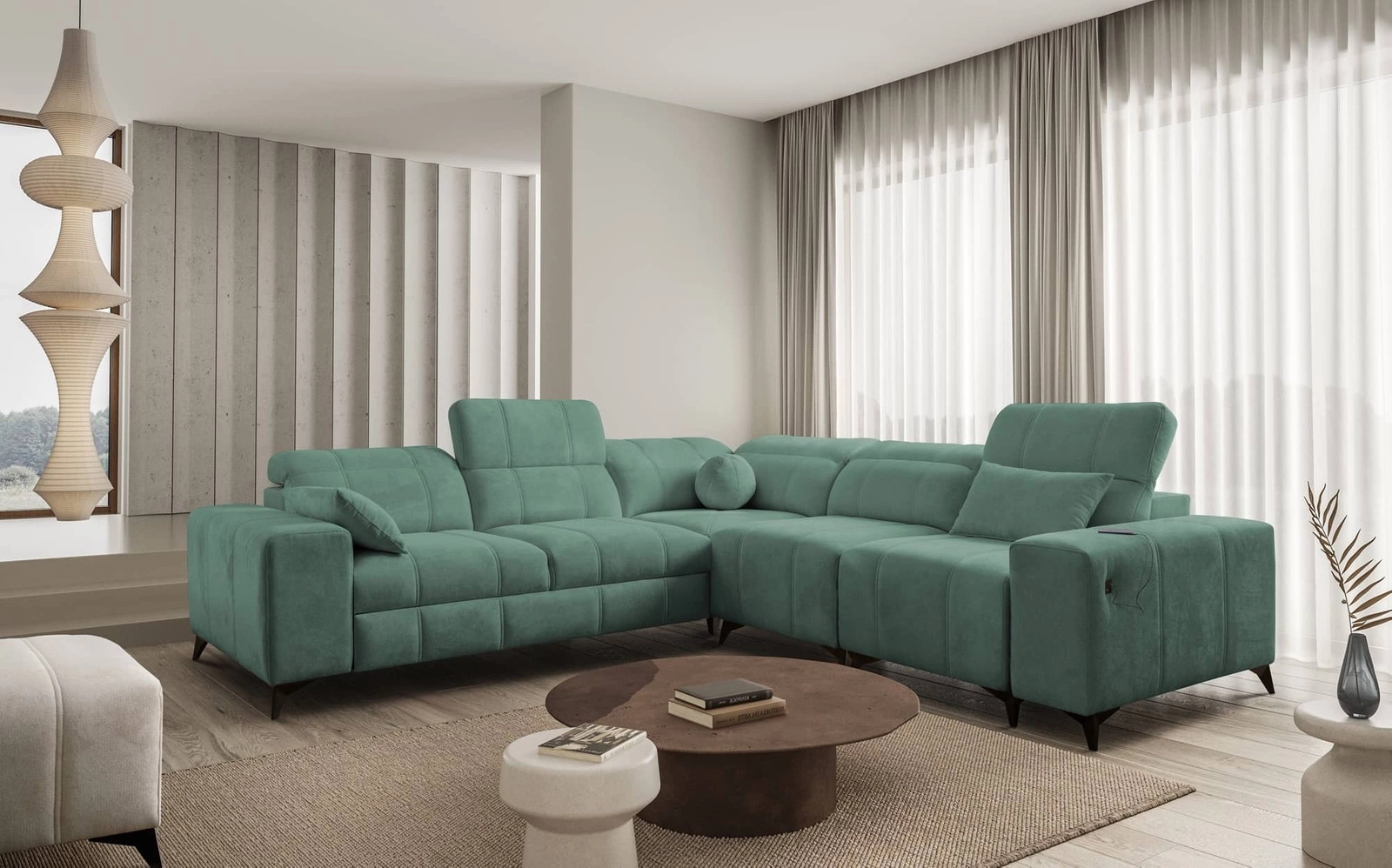 Narożnik Penejos III w kolorze zielonym z regulowanymi zagłówkami to zachwycający mebel z gwarancją najwyższego komfortu i funkcjonalności.