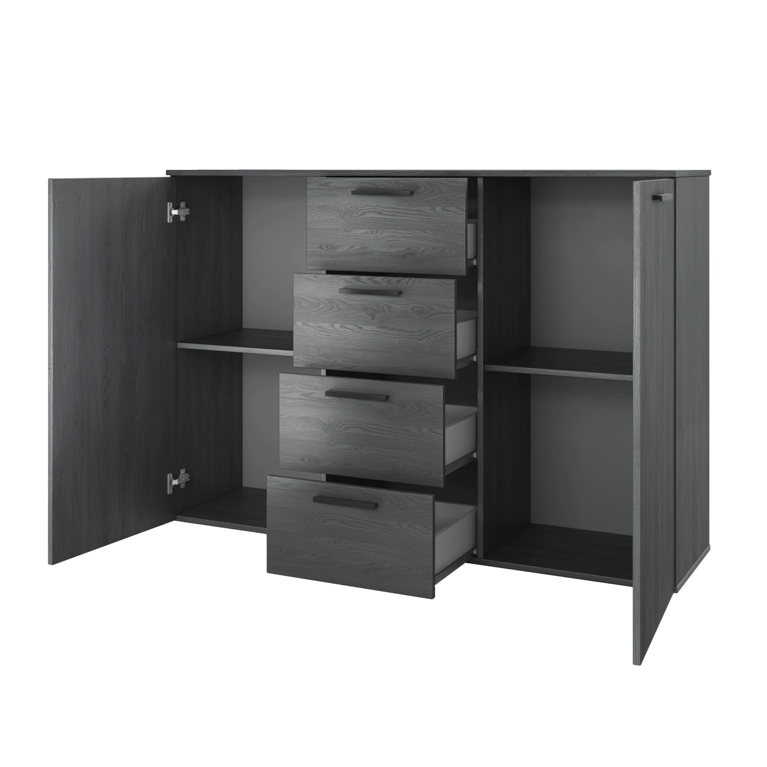Zestaw mebli Galaxy powstał z myślą o modnych i nowoczesnych wnętrzach. Niezwykłe połączenie dębowego dekoru z czarnymi dodatkami sprawia, że całość prezentuje się bardzo stylowo. Obecność mebli Galaxy stanie się stylowym wykończeniem pomieszczenia oraz nada mu niepowtarzalnego klimatu. Czarne uchwyt to elementy, które przyciągają wzrok i sprawiają, że całość prezentuje się bardzo gustownie.