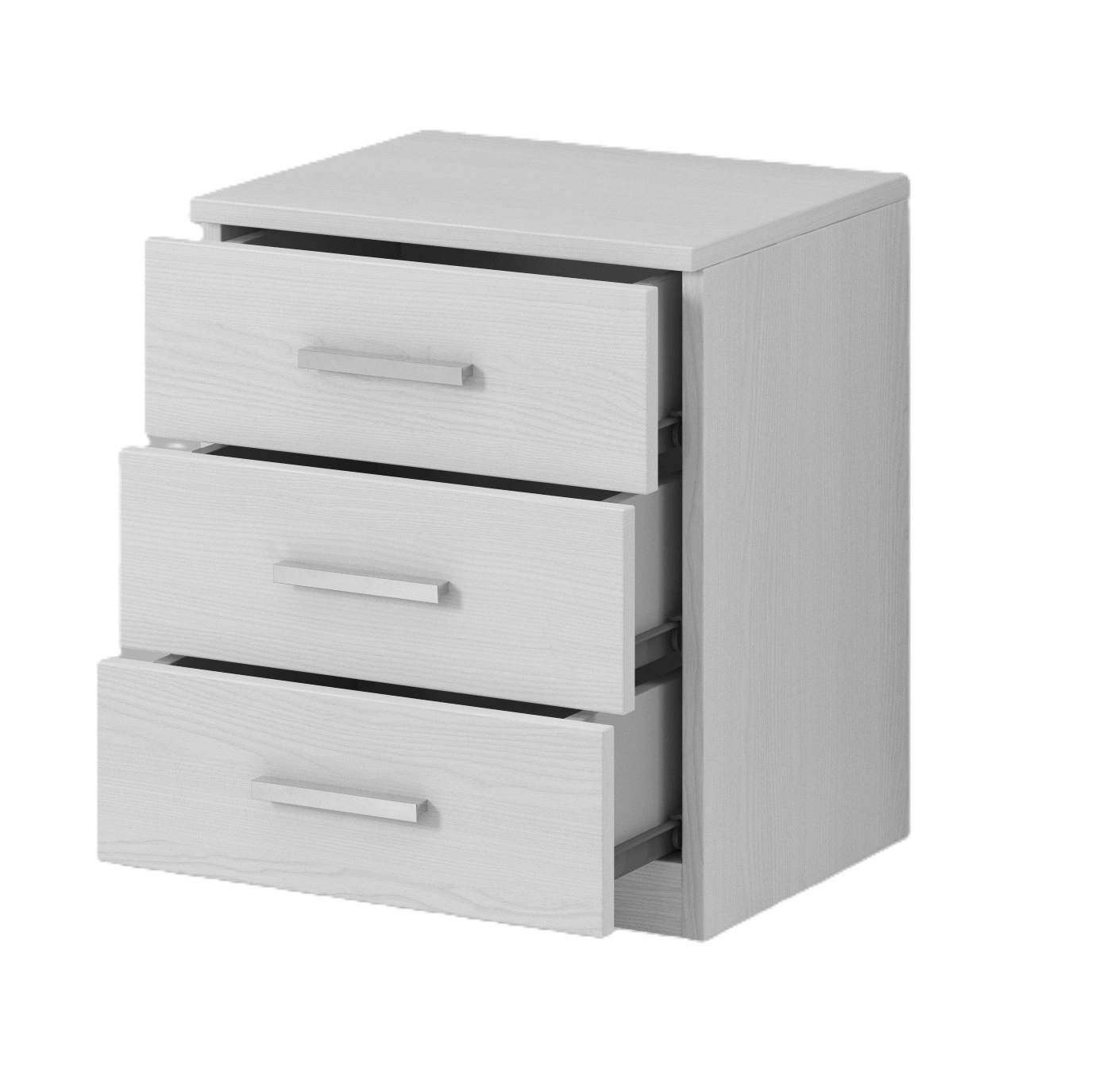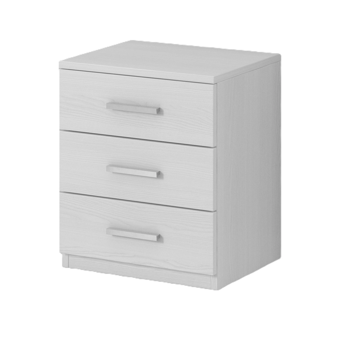 Pojemne szuflady pomieszczą wszystkie akcesoria. Szafka nocna wykonana została z wysokiej jakości płyty laminowanej o grubości 15mm, która charakteryzuje się odpornością na wpływ czynników zewnętrznych takich jak obicia, uderzenia i niefortunne zadrapania. Korpus oraz fronty są pokryte folią membranową w modnym kolorze biały abisko ash, która charakteryzuje się wysoką odpornością na wpływ czynników zewnętrznych. Stylowym wykończeniem frontów szuflad są srebrne uchwyty, które poza swoją podstawową funkcją, nadają niezwykle gustownego wyglądu.