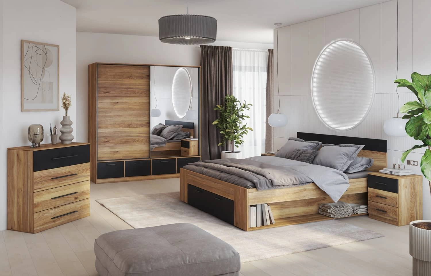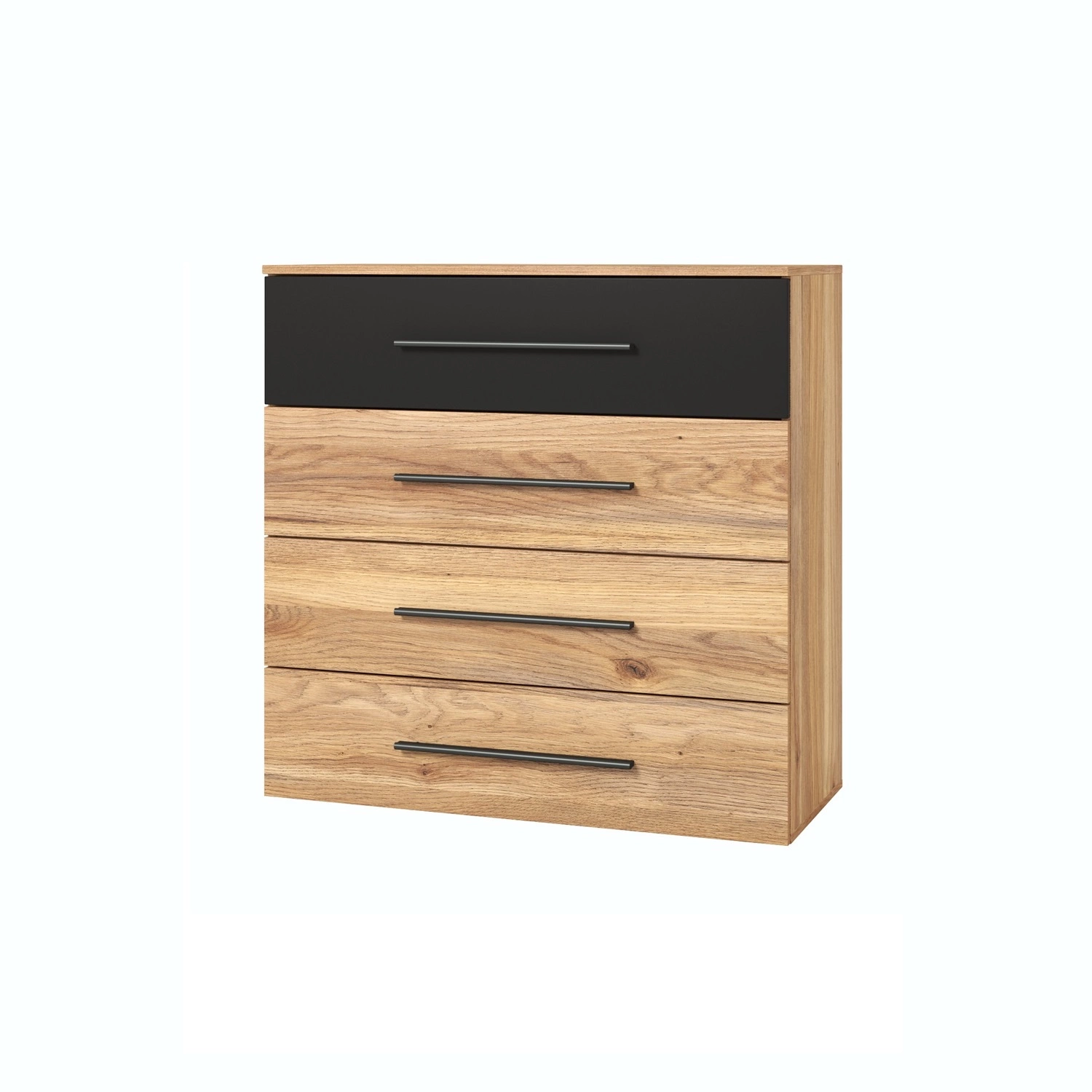 Komoda z szufladami Beta to zachwycający mebel o szczególnym i niepowtarzalnym charakterze. Niezwykłe połączenie dębowego dekoru z czernią sprawia, że całość prezentuje się bardzo stylowo. Obecność komody stanie się stylowym wykończeniem pomieszczenia oraz nada mu szczególnego charakteru. Stylowym wykończeniem frontów szuflad są czarne uchwyty, które poza swoją podstawową funkcją, nadają niezwykle gustownego wyglądu.