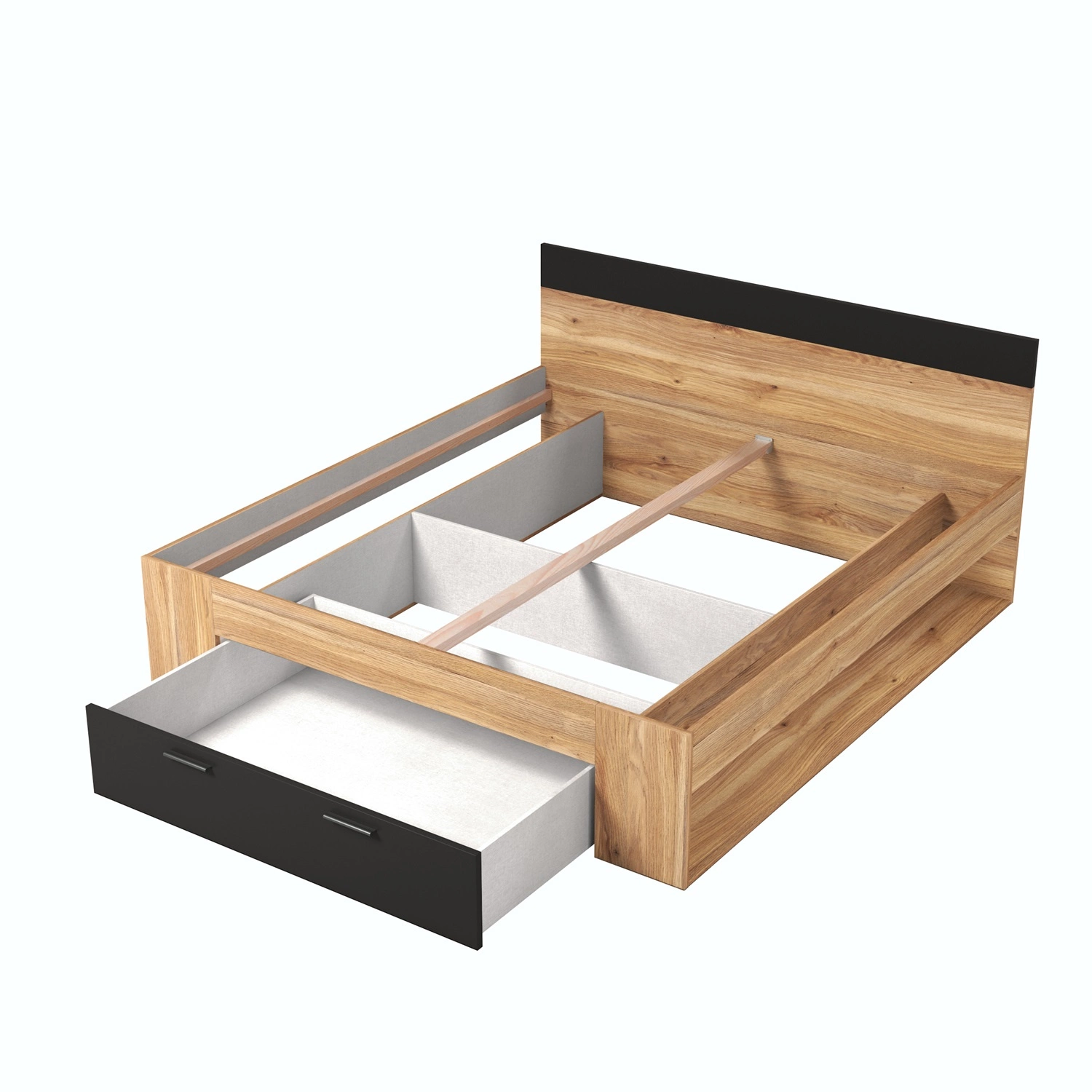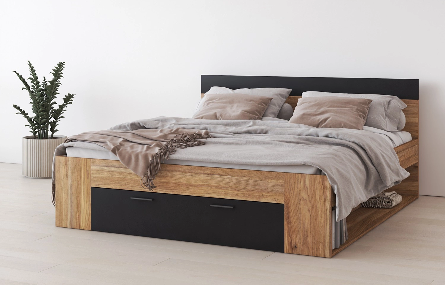 Łóżko z szufladą Beta 180x200 cm dąb mauvella / czarny to idealne łóżko do sypialni lub pokoju młodzieżowego z zagłówkiem