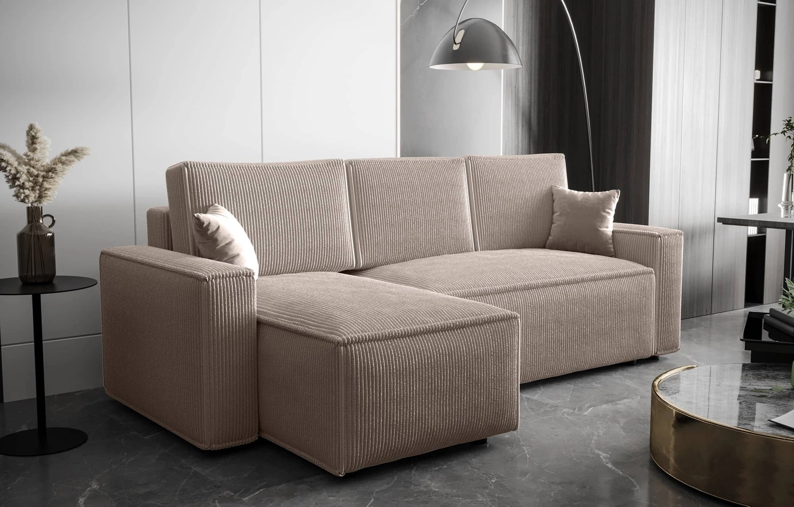 Trójwymiarowa sztruksowa tkanina o wyrazistych i grubych prążkach nadaje szczególnego charakteru oraz wyjątkowej urody. Tkanina jest bardzo miękka, a przy tym mocna i wytrzymała. Tkanina obiciowa Poso jest odporna na ścieranie, a także łatwa do utrzymania w czystości. Dzięki temu narożnik rozkładany Nelo przez długi czas będzie wyglądał estetycznie i elegancko. Narożnik z funkcją spania codziennego wykonany został z wysokiej jakości materiałów, które charakteryzują się odpornością na wpływ czynników zewnętrznych takich jak obicia mebla oraz różnego typu uderzenia.