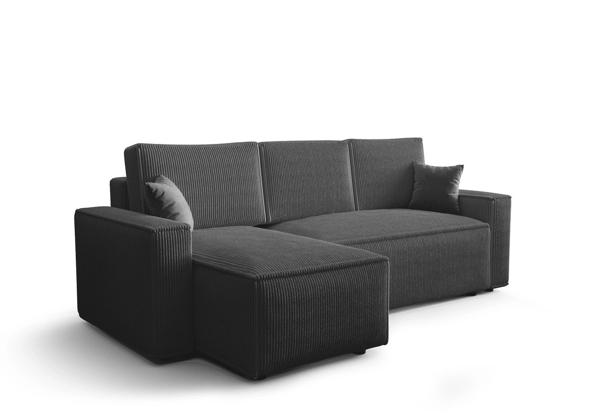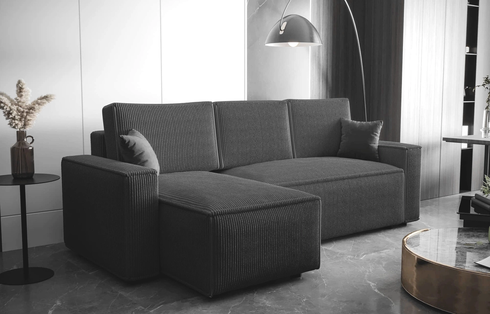 Trójwymiarowa sztruksowa tkanina o wyrazistych i grubych prążkach nadaje szczególnego charakteru oraz wyjątkowej urody. Tkanina jest bardzo miękka, a przy tym mocna i wytrzymała. Tkanina obiciowa Poso jest odporna na ścieranie, a także łatwa do utrzymania w czystości. Dzięki temu narożnik rozkładany Nelo przez długi czas będzie wyglądał estetycznie i elegancko. Narożnik z funkcją spania codziennego wykonany został z wysokiej jakości materiałów, które charakteryzują się odpornością na wpływ czynników zewnętrznych takich jak obicia mebla oraz różnego typu uderzenia.