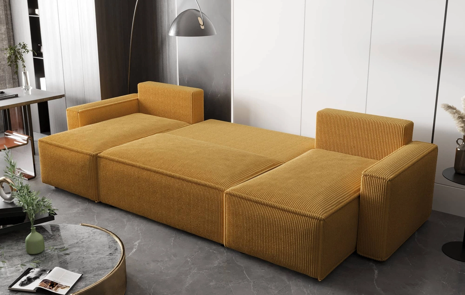 - Narożnik z funkcją spania Nelo U to nowoczesny i komfortowy mebel utrzymany w minimalistycznej formie. Narożnik pokryty jest miękką i wytrzymałą sztruksową tkaniną.