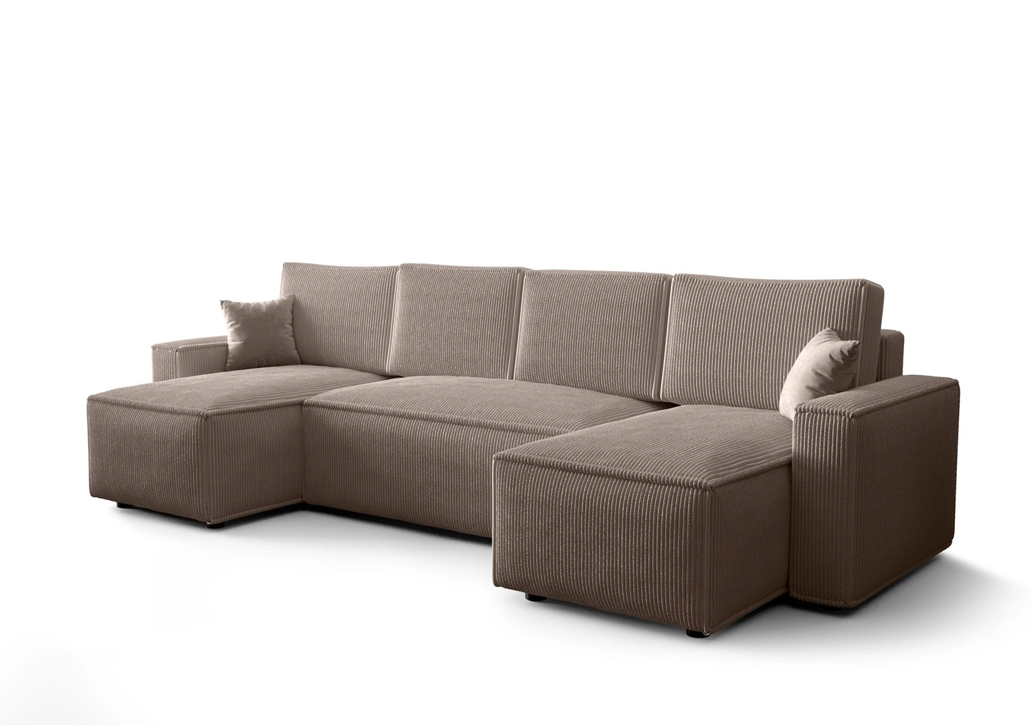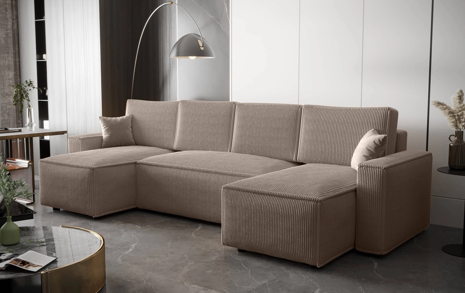 Narożnik z funkcją spania Nelo U beżowy komfortowy i nowoczesny narożnik z pojemnikiem na pościel sztruksowa prążkowana tkanina
