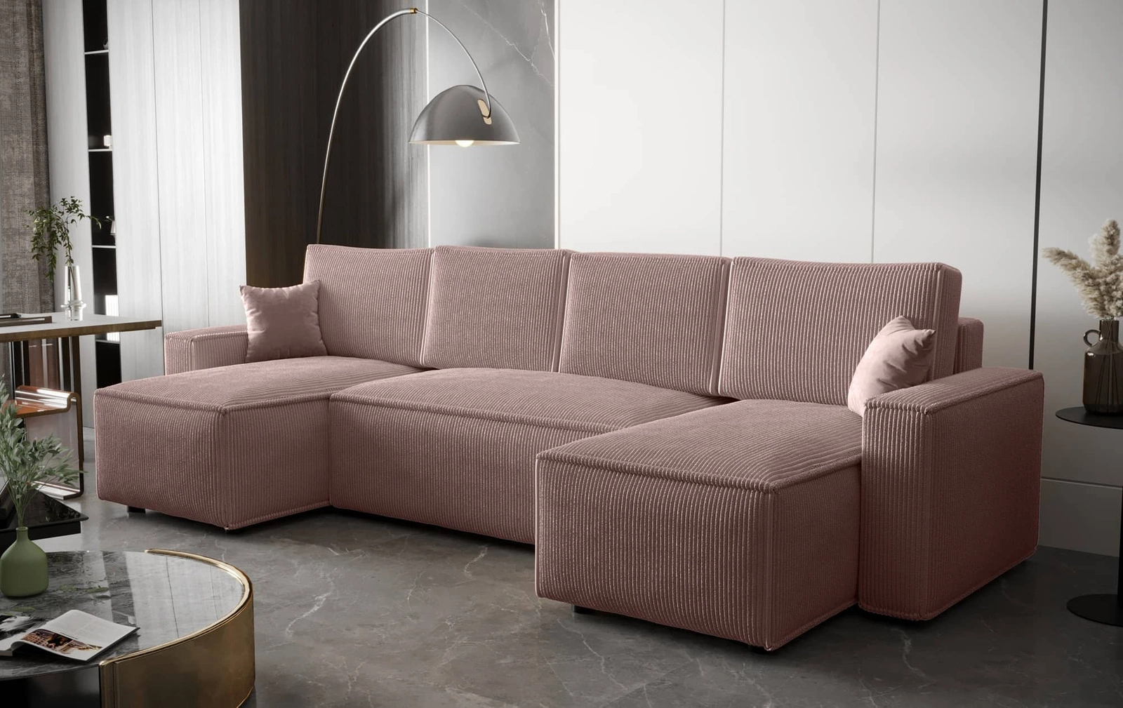 Narożnik z funkcją spania Nelo U wrzosowy komfortowy i nowoczesny narożnik z pojemnikiem na pościel sztruksowa prążkowana tkanina
