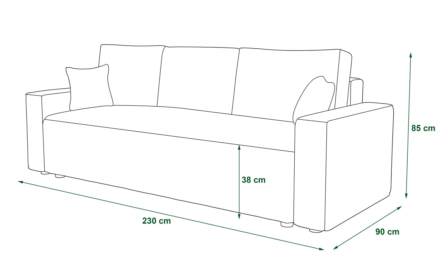 Rozłożenie pełnej powierzchni spania jest bardzo łatwe i nie wymaga użycia dużej siły. Siedzisko jest wysuwane na drewnianych płozach. Powierzchnia spania kanapy wynosi 131x197 cm. Mebel wyposażony został w niskie nóżki wykonane z tworzywa sztucznego. Gwarantuje komfortowe i bezproblemowe korzystanie oraz trwałość całego mebla przez wiele lat użytkowania. Idealnie sprawdzi się w roli kanapy do salonu, kanapy z funkcją spania oraz każdym wnętrzu urządzonym w Twoim ulubionym stylu.
