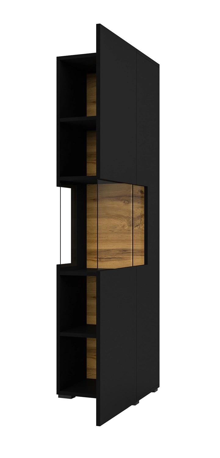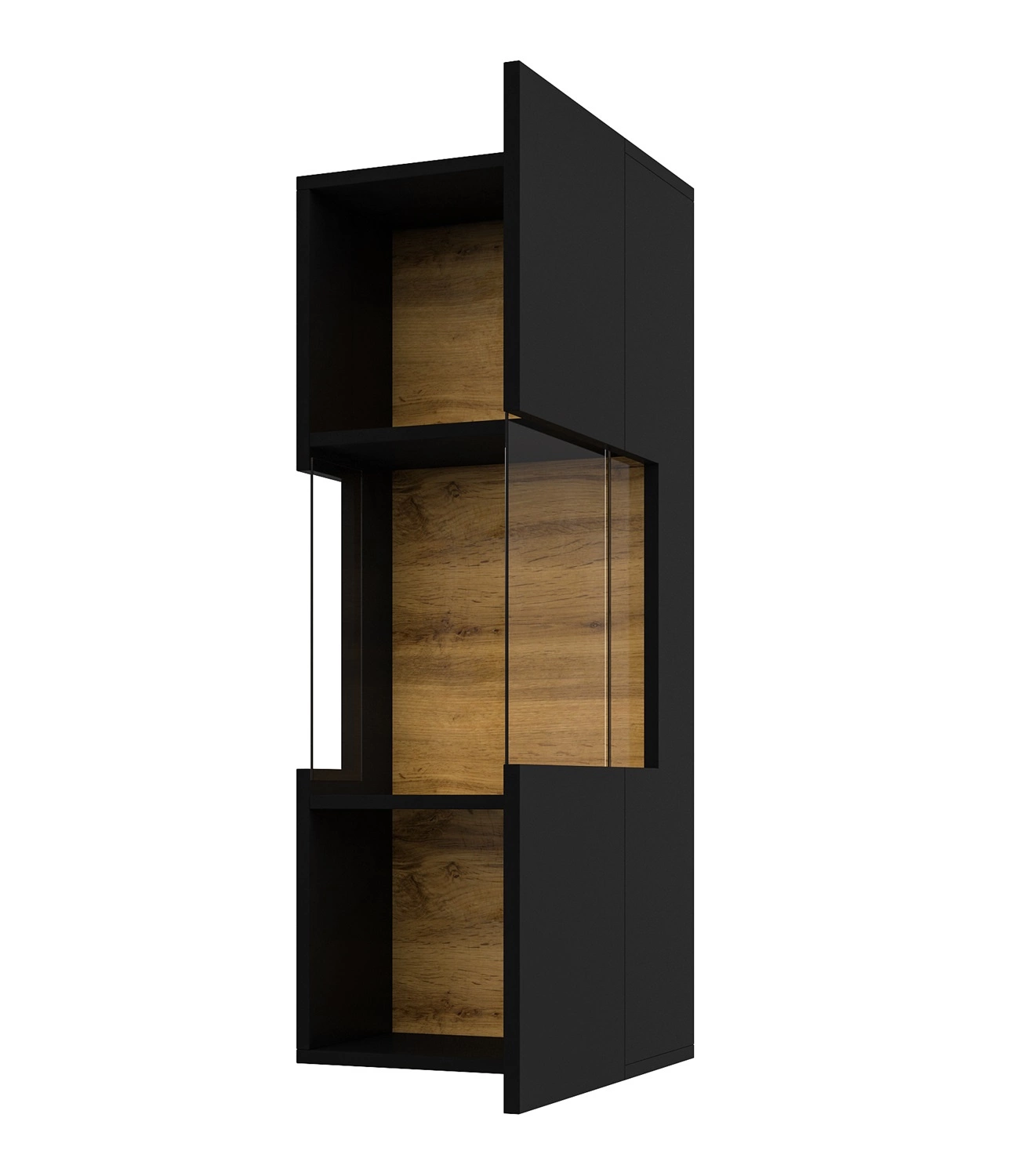 Zestaw mebli Ava to meble o minimalistycznej formie oraz oryginalnym wykończeniu. Proste bryły tworzone na wzór geometrii stworzą harmonijne i niepowtarzalne wnętrze. Klasyczna czerń sprawia, że meblościanka prezentuje się bardzo elegancko i szykownie. Wstawki w kolorze dąb wotan podkreślają nietuzinkowość oraz elegancję mebli do salonu. Zestaw mebli Ava stworzy oryginalną i niebanalną dekorację.