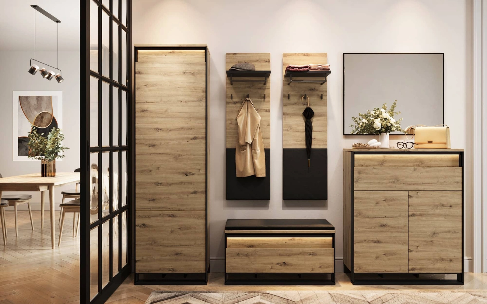 - Wieszak ścienny Quant to elegancki dodatek do przedpokoju lub garderoby. Wieszak dopełni każdą aranżację oraz nada funkcjonalności. Połączenie czerni z dębowym dekorem podkreśla ponadczasowość mebla. Wykonanie z wysokiej jakości płyty laminowanej.