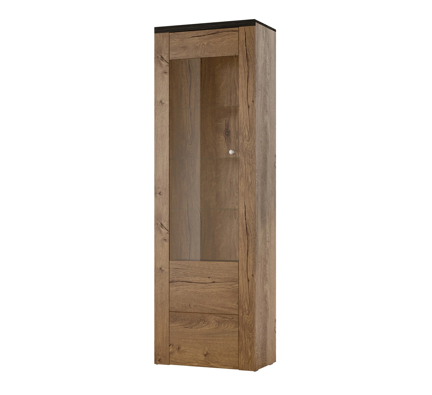 Witryna Larona to mebel o minimalistycznej formie oraz oryginalnym wykończeniu. Prosta bryła tworzona na wzór geometrii stworzy harmonijne i niepowtarzalne wnętrze. Klasyczny odcień dębu został przełamany wstawkami w kolorze touchwood co sprawia, że witryna prezentuje się bardzo elegancko i szykownie. Minimalistyczny uchwyt w kolorze srebrnym to element, który przyciągają wzrok i sprawia, że całość prezentuje się bardzo gustownie. Witryna Larona stworzy oryginalną i niebanalną dekorację.