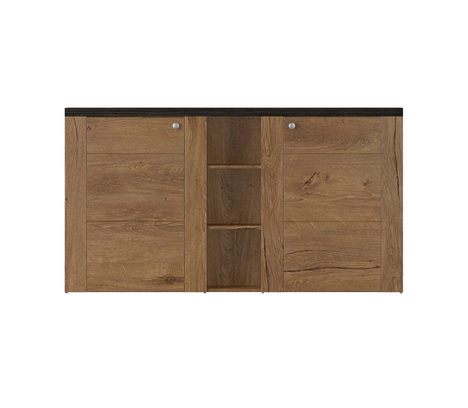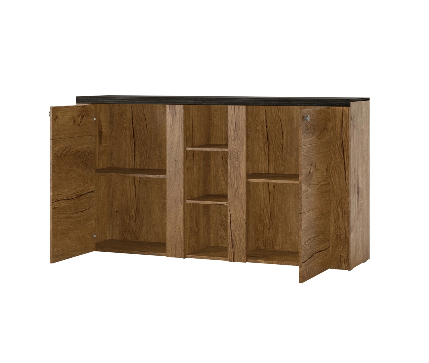 Komoda do salonu skonstruowana jest z 2 drzwi oraz otwartych półek. Komoda do salonu gwarantuje komfortowe i bezproblemowe korzystanie oraz trwałość całego mebla przez wiele lat użytkowania. Ciepłe wybarwienie dębu nada pomieszczeniu lekkości i przytulnego klimatu, dzięki czemu komoda Larona świetnie sprawdzi się w roli komody do salonu lub komody do pokoju dziennego. Komoda z powodzeniem odnajdzie się także jako mebel biurowy lub komoda do sypialni.