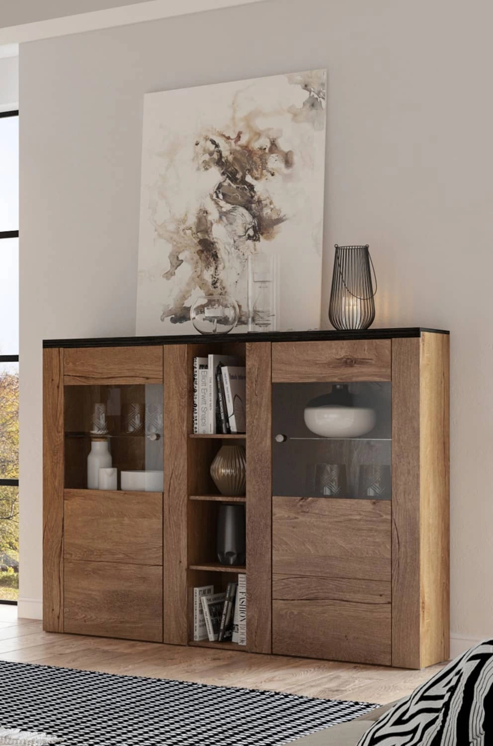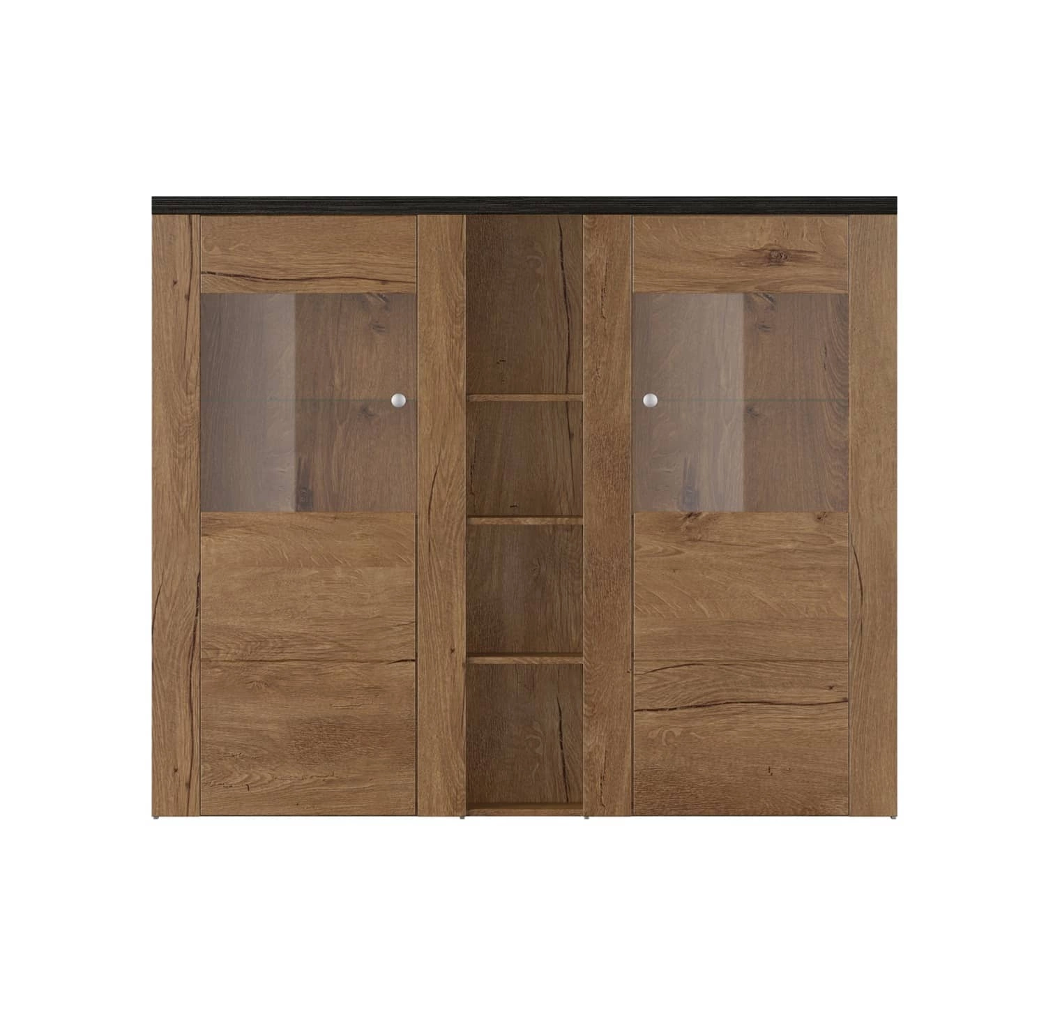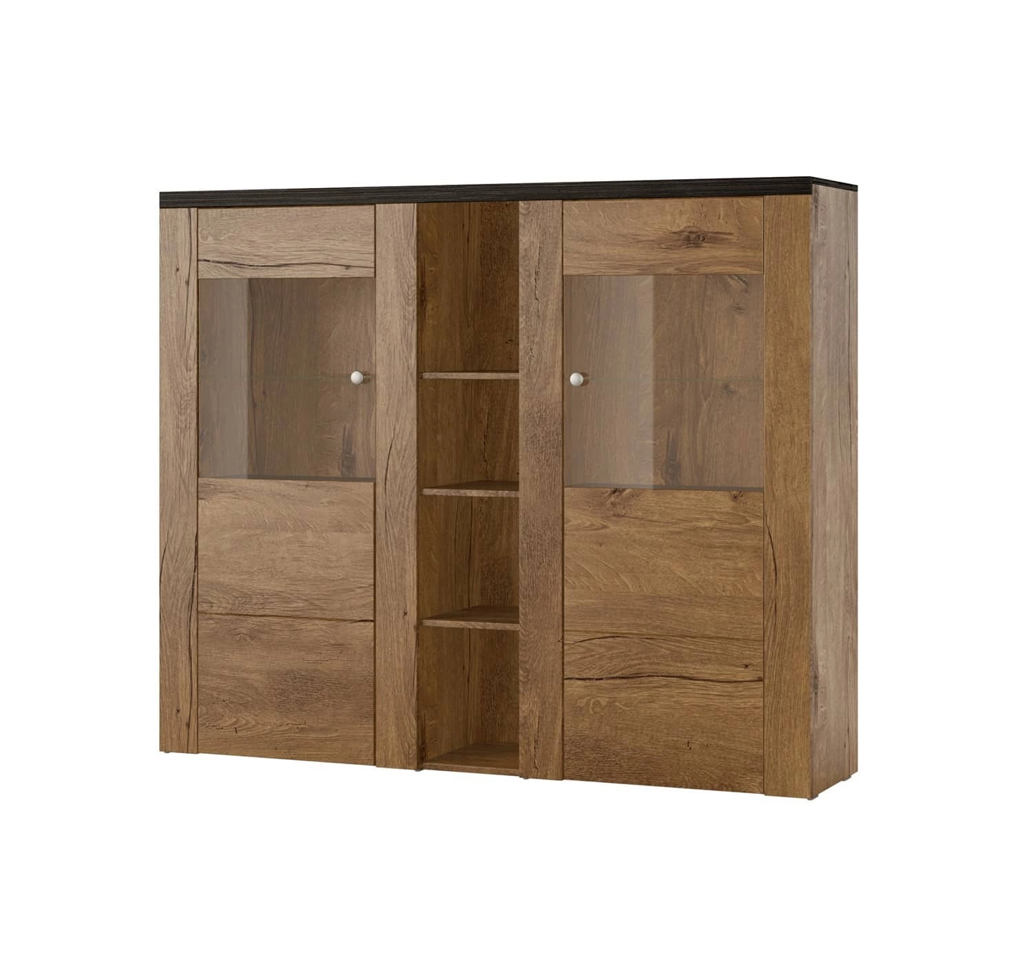 Komoda wysoka do salonu skonstruowana jest z 2 drzwi oraz otwartych półek. Przeszklony front komody wykonany jest z bezpiecznego szkła hartowanego. Komoda do salonu gwarantuje komfortowe i bezproblemowe korzystanie oraz trwałość całego mebla przez wiele lat użytkowania. Ciepłe wybarwienie dębu nada pomieszczeniu lekkości i przytulnego klimatu, dzięki czemu komoda wysoka Larona świetnie sprawdzi się w roli komody do salonu lub komody do pokoju dziennego. Komoda z powodzeniem odnajdzie się także jako mebel biurowy lub komoda do sypialni.