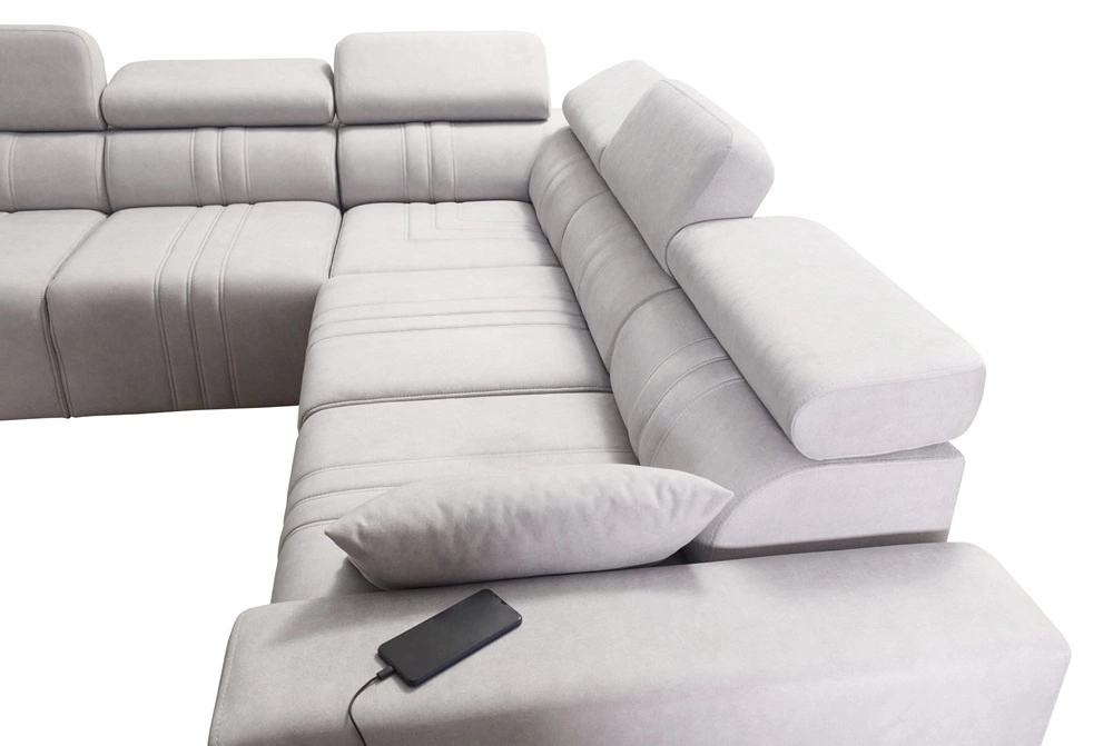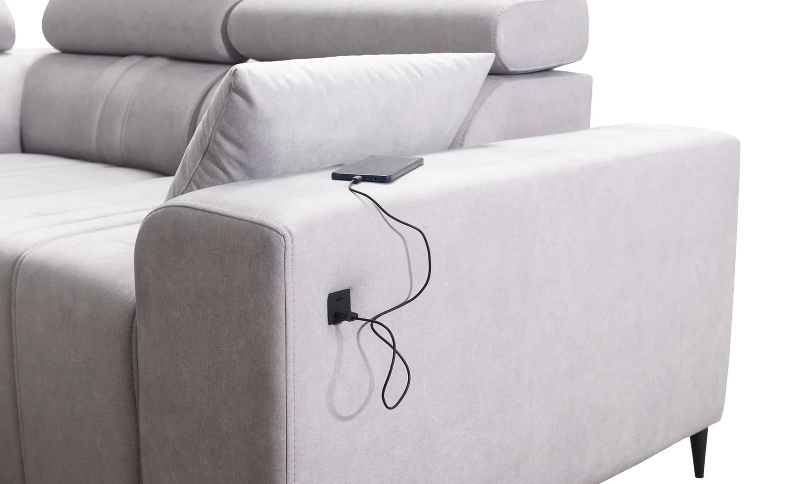 Dodatki tego mebla, które docenią wszyscy użytkownicy to dwa pojemniki na pościel, regulowane zagłówki oraz gniazdo ładowania USB w boczku narożnika.
