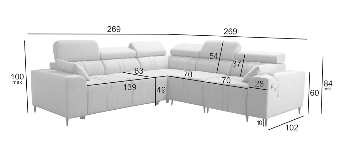 Wymiary mebla pozwolą na zapełnienie przestrzeni w przestronnym salonie lub pokoju dziennym. Szerokość narożnika 269 cm, wysokość maksymalna 100 cm oraz głębokość 269 cm. Powierzchnia spania narożnika wynosi 132x207 cm. Wysokość siedziska mebla to 49 cm a maksymalna wysokość oparcia wynosi 54 cm. Sprężyny faliste oraz pianka poliuretanowa T30 to materiał, z którego wykonane zostało siedzisko narożnika. Oparcie stałe z regulowanymi zagłówkami pozwoli na łatwe dostosowanie kąta nachylenia zagłówków do swoich preferencji oraz daje gwarancję wygodnego wypoczynku po długim dniu, które docenisz Ty, Twoi bliscy a także goście, którzy zasiądą na tym wyjątkowym narożniku.