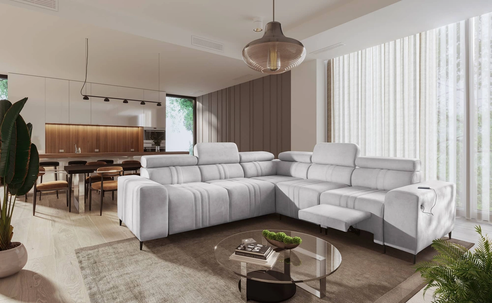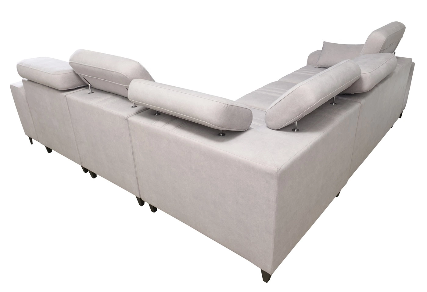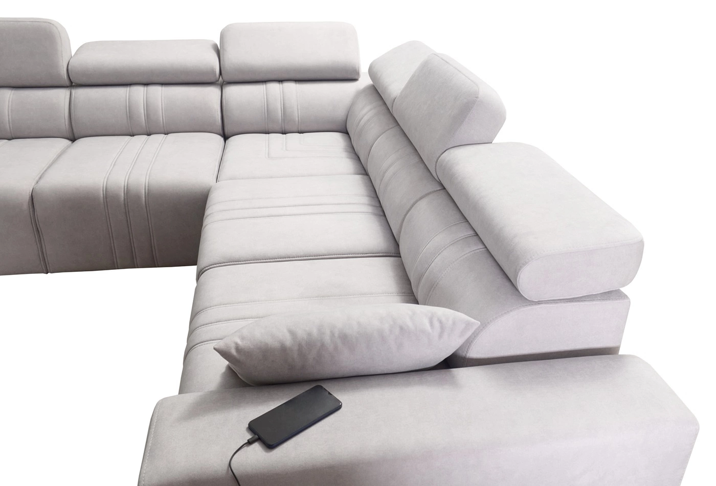 Dodatki tego mebla, które docenią wszyscy użytkownicy to wysuwany podnóżek, regulowane zagłówki, pojemnik na pościel oraz gniazdo ładowania USB w boczku narożnika.
