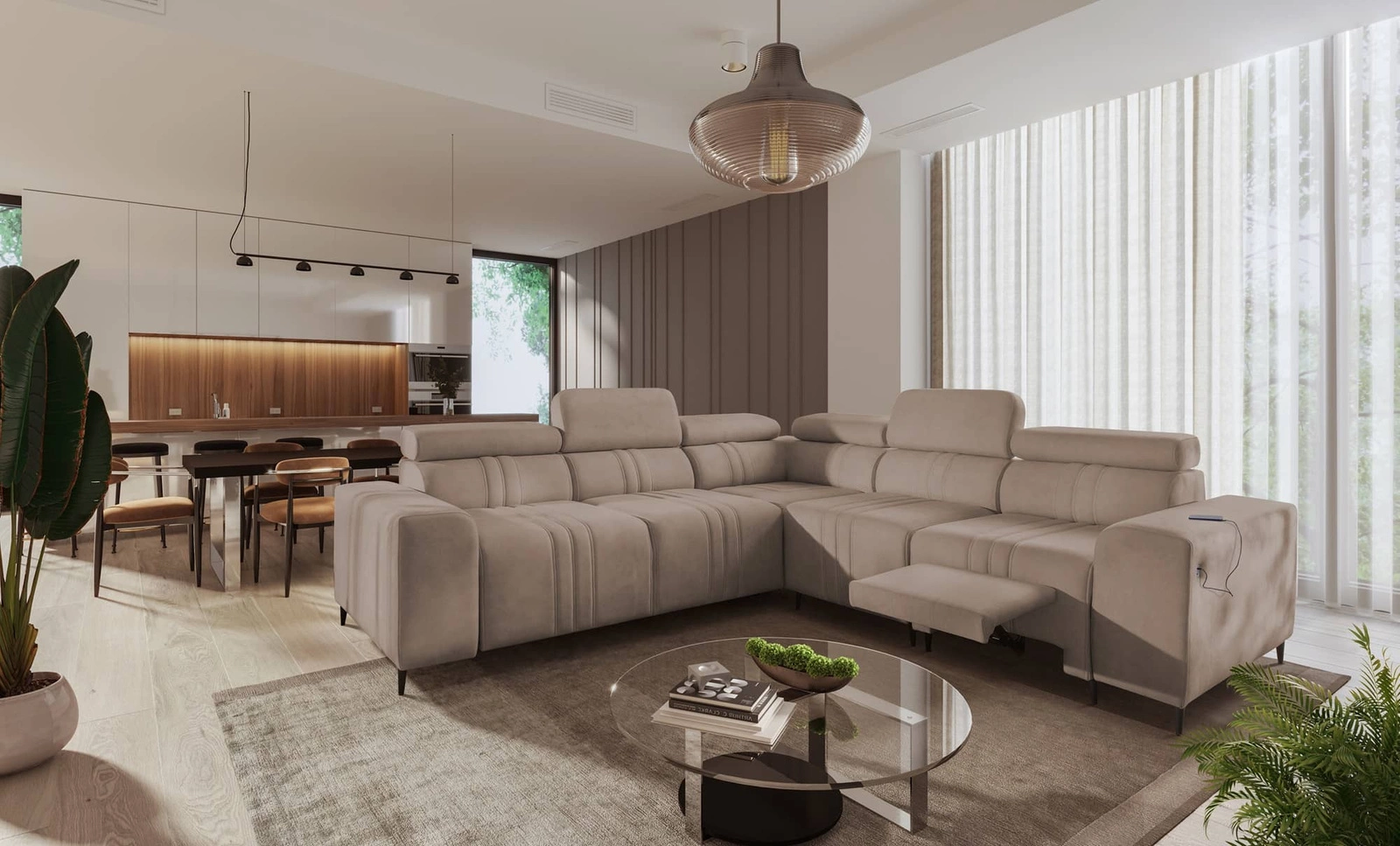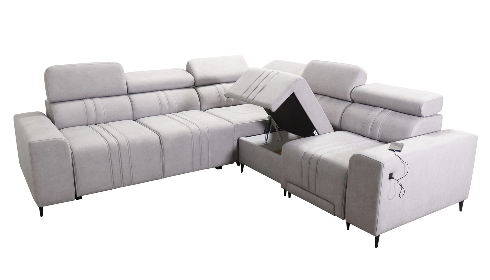 Dodatki tego mebla, które docenią wszyscy użytkownicy to wysuwany podnóżek, regulowane zagłówki, pojemnik na pościel oraz gniazdo ładowania USB w boczku narożnika.
