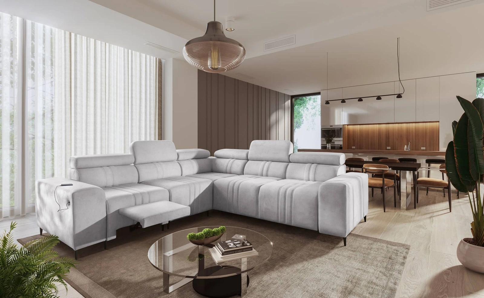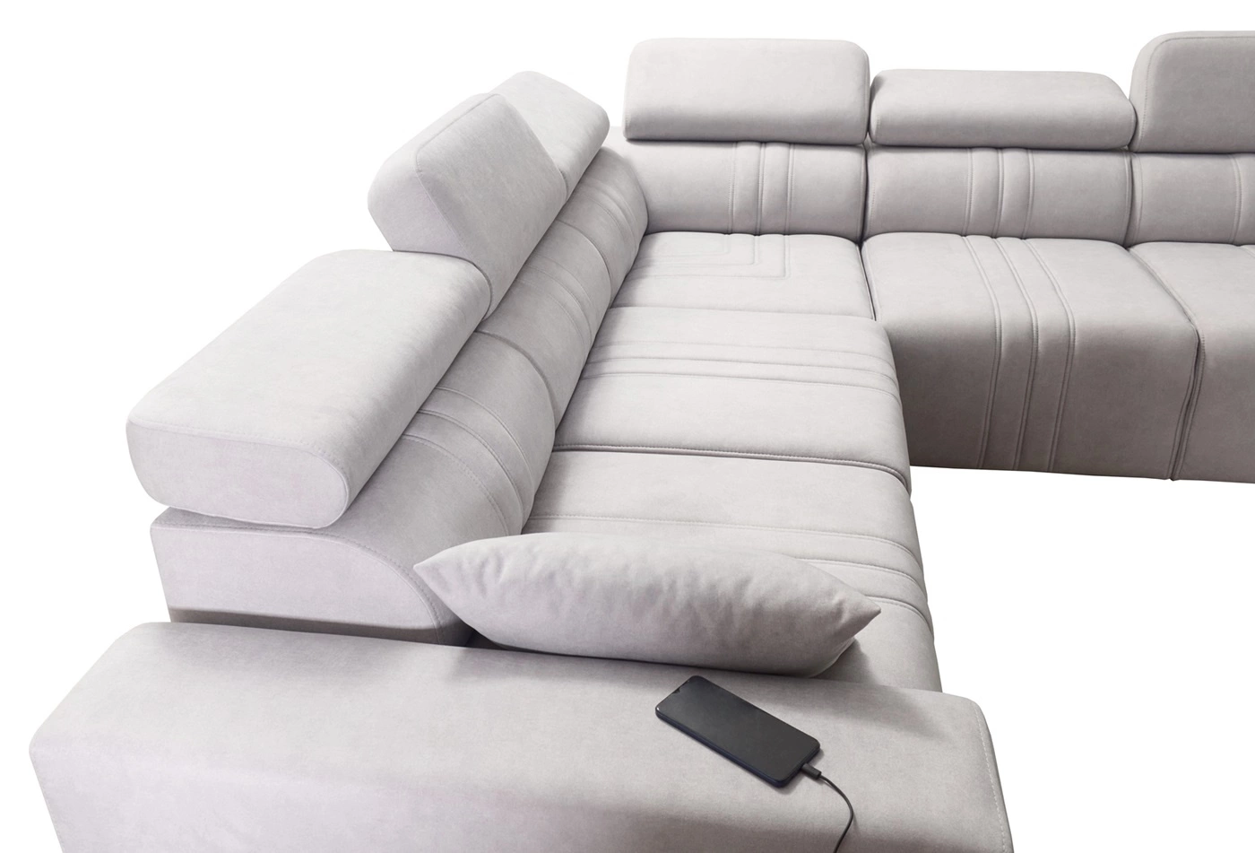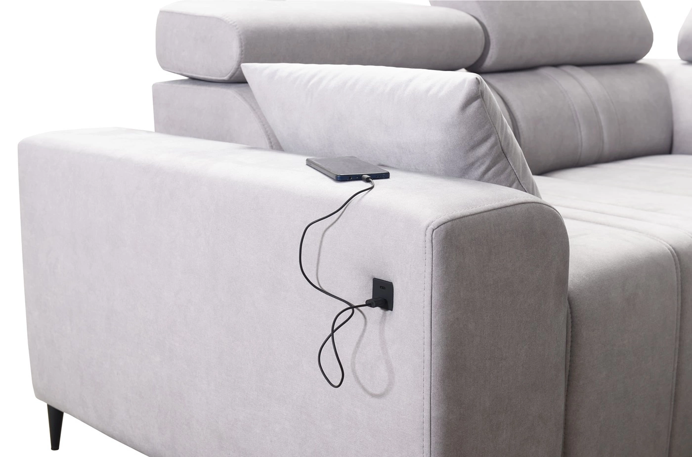 Dodatki tego mebla, które docenią wszyscy użytkownicy to wysuwany podnóżek, regulowane zagłówki, pojemnik na pościel oraz gniazdo ładowania USB w boczku narożnika.
