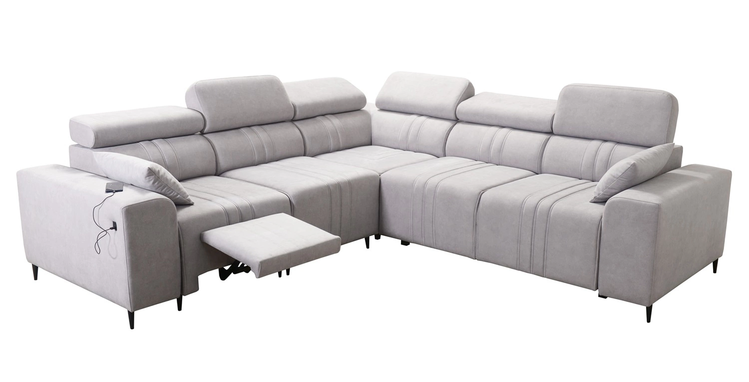 Dodatki tego mebla, które docenią wszyscy użytkownicy to wysuwany podnóżek, regulowane zagłówki, pojemnik na pościel oraz gniazdo ładowania USB w boczku narożnika.