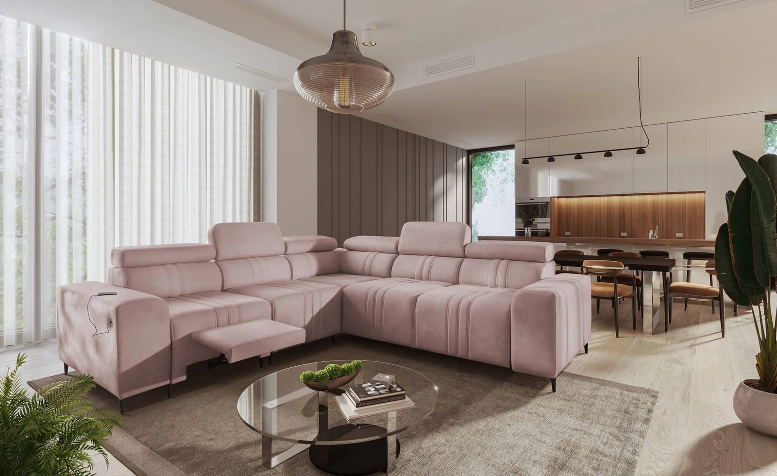 Narożnik Castel III Lux w kolorze różowym z wysuwanym podnóżkiem to niezwykle komfortowy mebel o ciekawym wykończeniu.