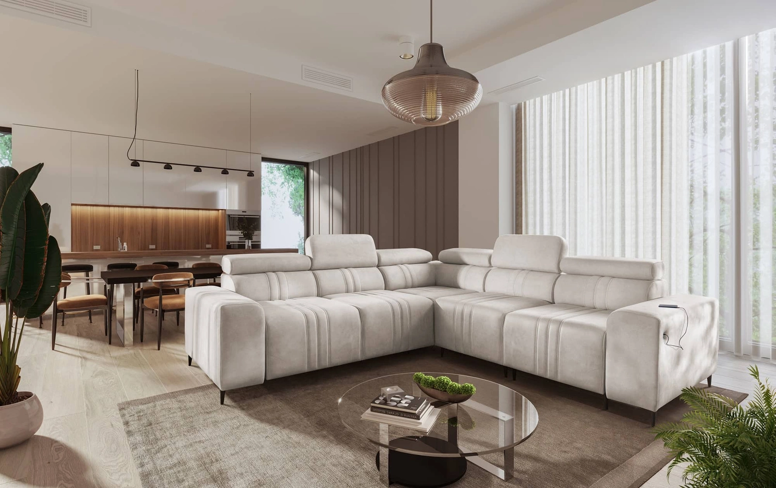 Dodatki tego mebla, które docenią wszyscy użytkownicy to dwa pojemniki na pościel, regulowane zagłówki oraz gniazdo ładowania USB w boczku narożnika.