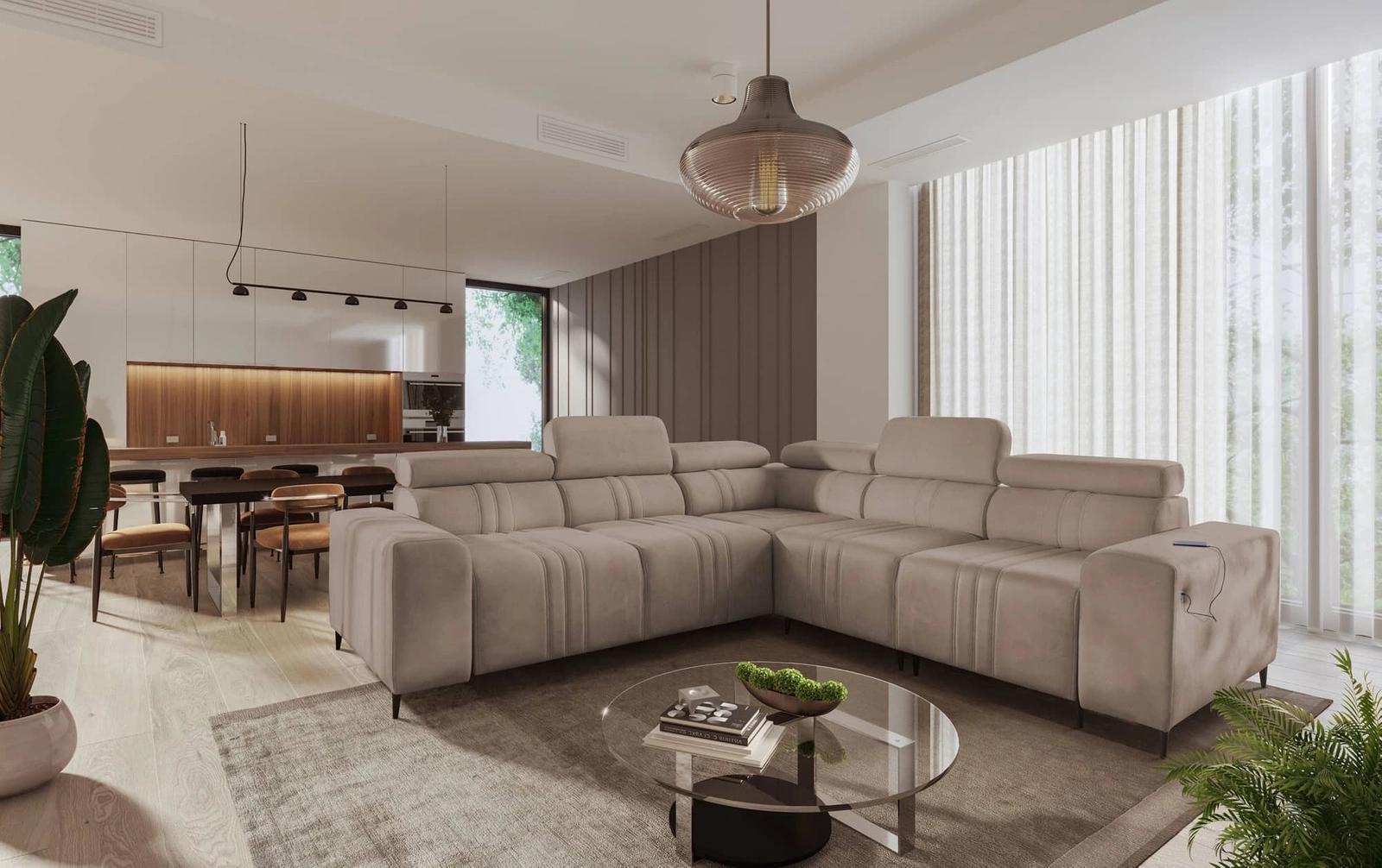 Dodatki tego mebla, które docenią wszyscy użytkownicy to dwa pojemniki na pościel, regulowane zagłówki oraz gniazdo ładowania USB w boczku narożnika.