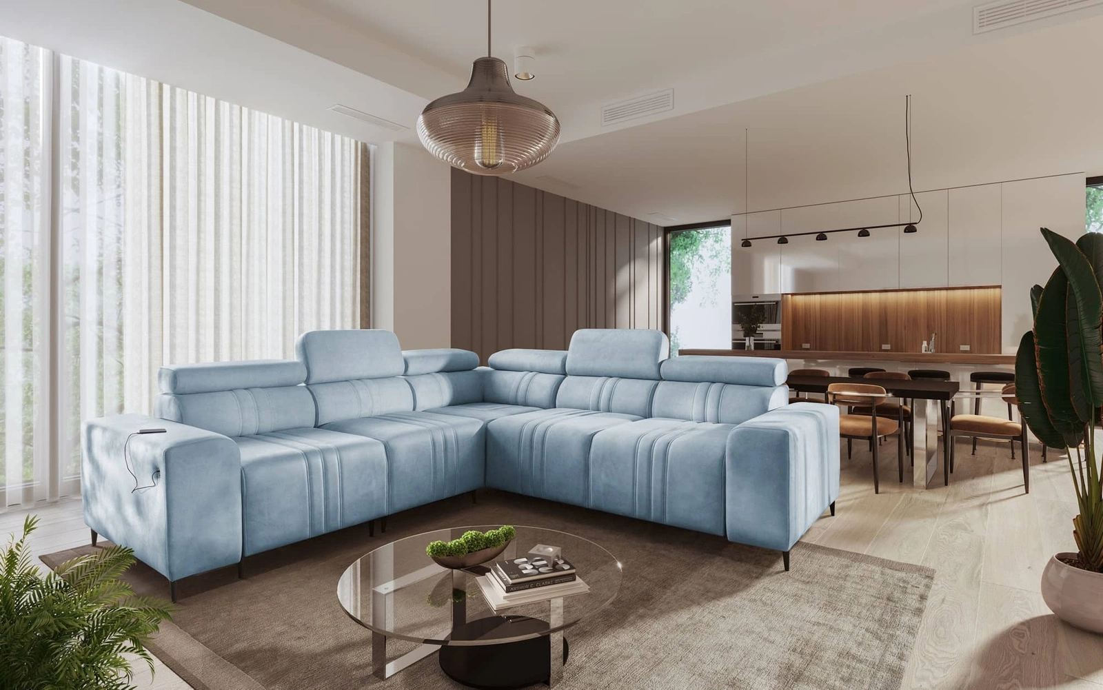 Narożnik Castel III w kolorze błękitnym z regulowanymi zagłówkami to niezwykle elegancki mebel o ciekawym wykończeniu.