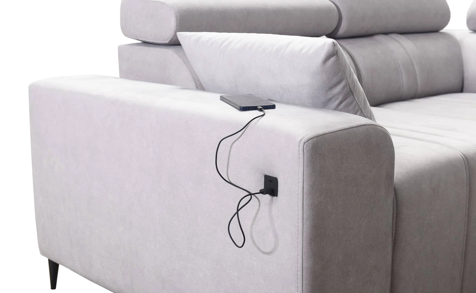 Dodatki tego mebla, które docenią wszyscy użytkownicy to dwa pojemniki na pościel, regulowane zagłówki oraz gniazdo ładowania USB w boczku narożnika.