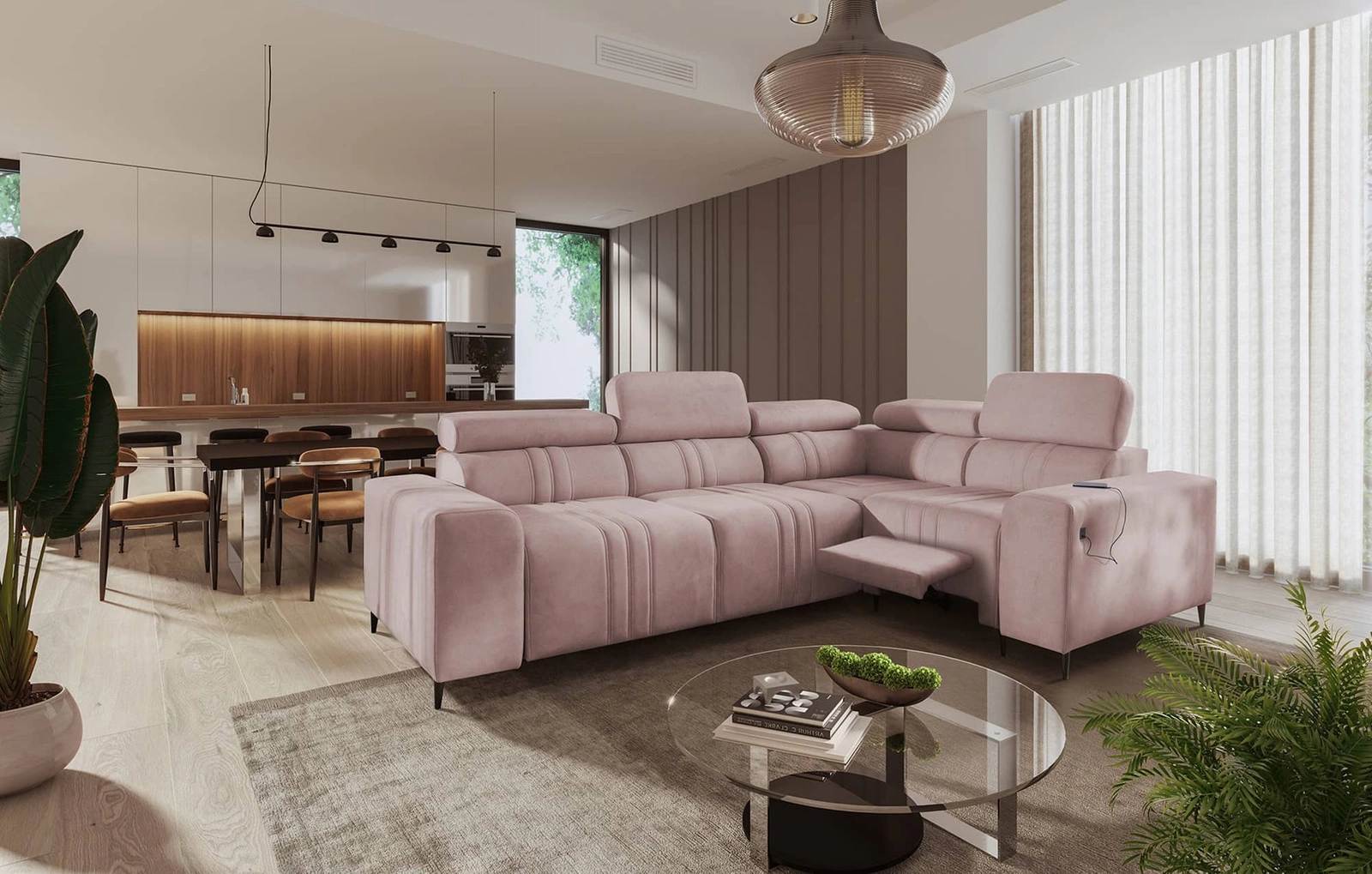 Dodatki tego mebla, które docenią wszyscy użytkownicy to wysuwany podnóżek, regulowane zagłówki oraz gniazdo ładowania USB w boczku narożnika.