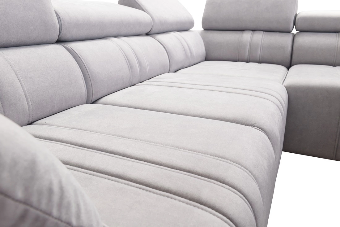 Dodatki tego mebla, które docenią wszyscy użytkownicy to wysuwany podnóżek, regulowane zagłówki oraz gniazdo ładowania USB w boczku narożnika.