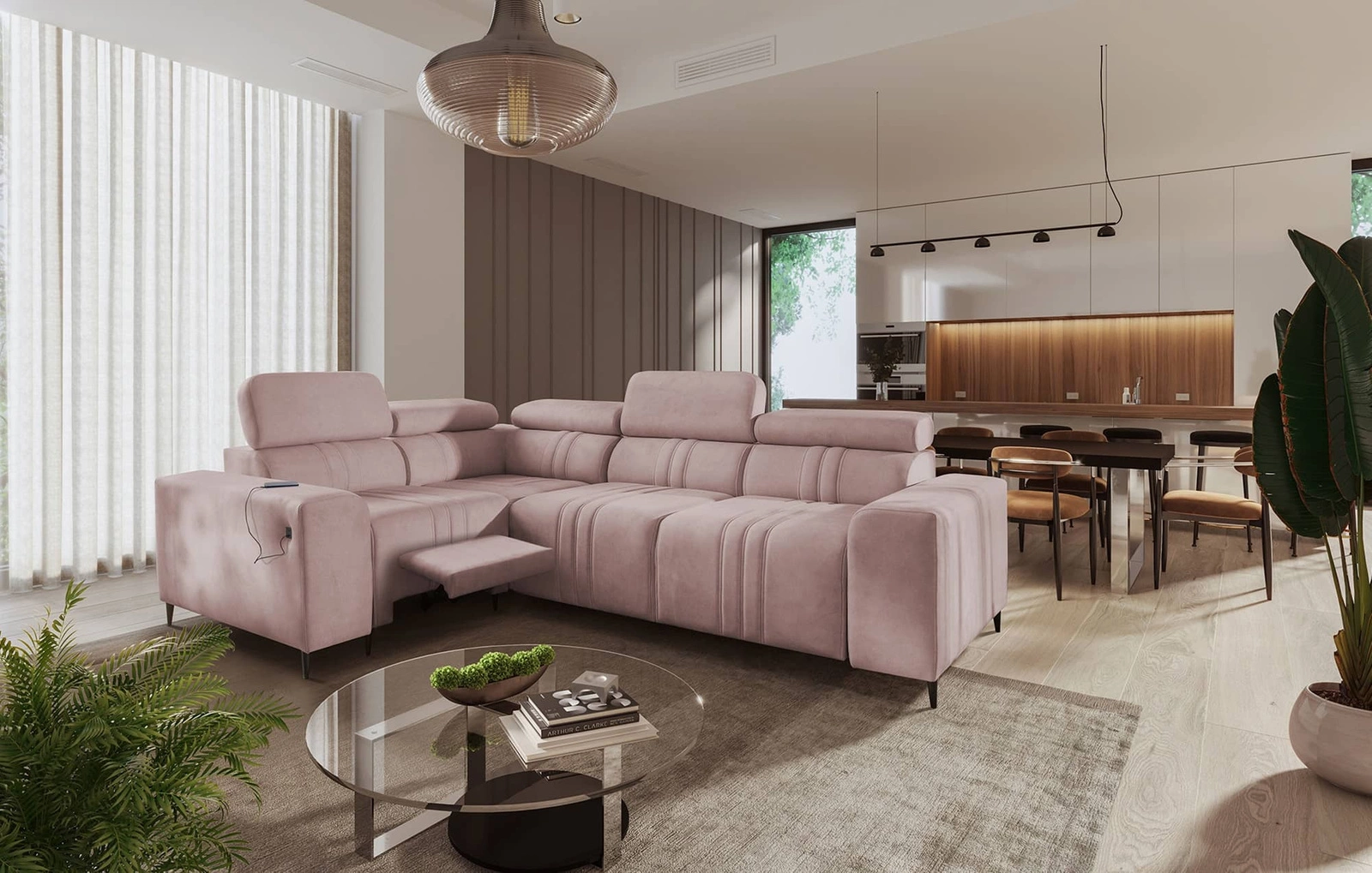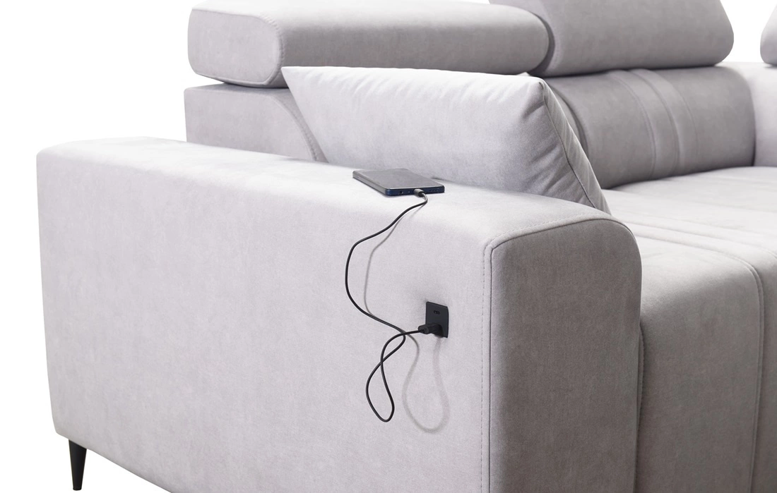 Dodatki tego mebla, które docenią wszyscy użytkownicy to wysuwany podnóżek, regulowane zagłówki oraz gniazdo ładowania USB w boczku narożnika.